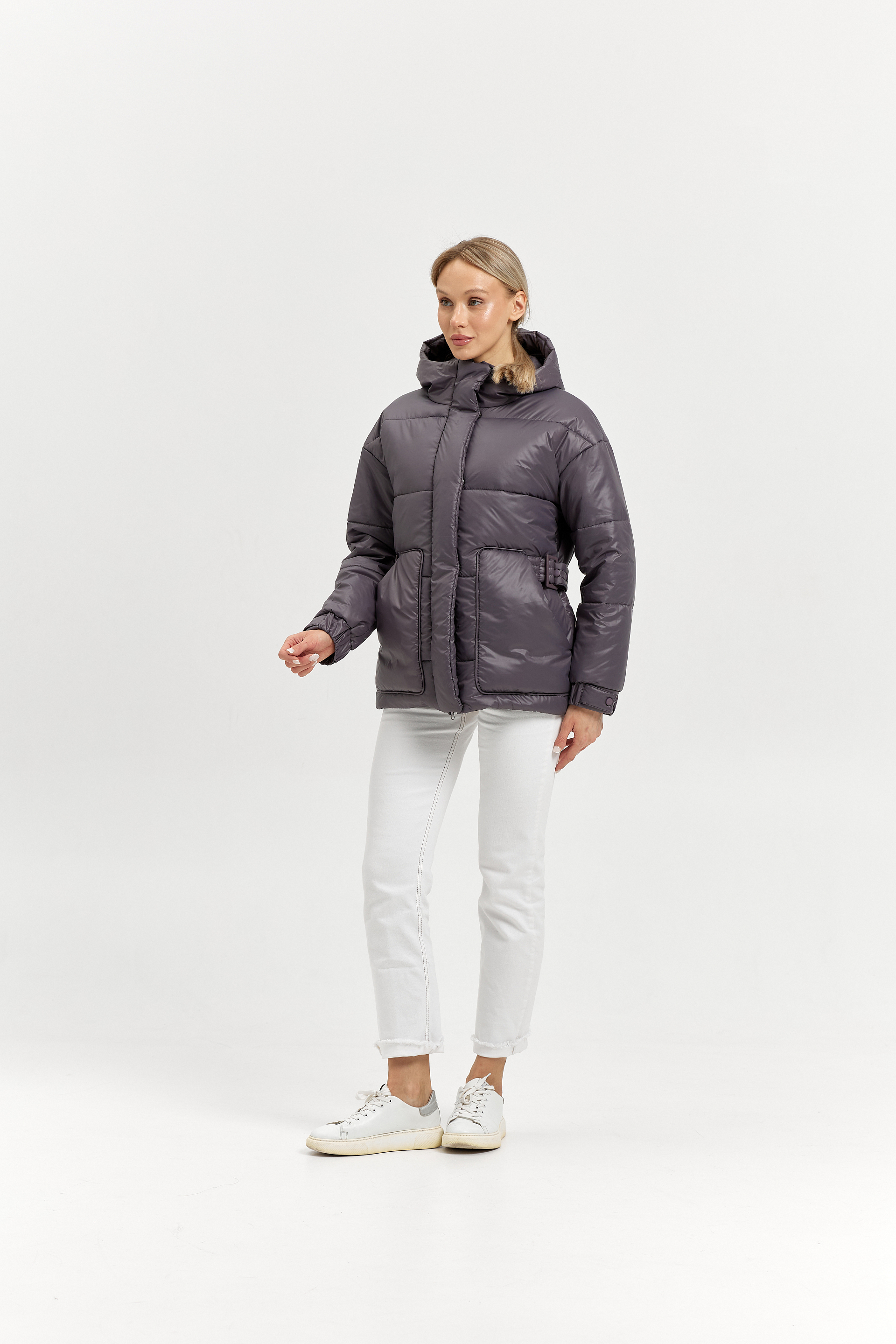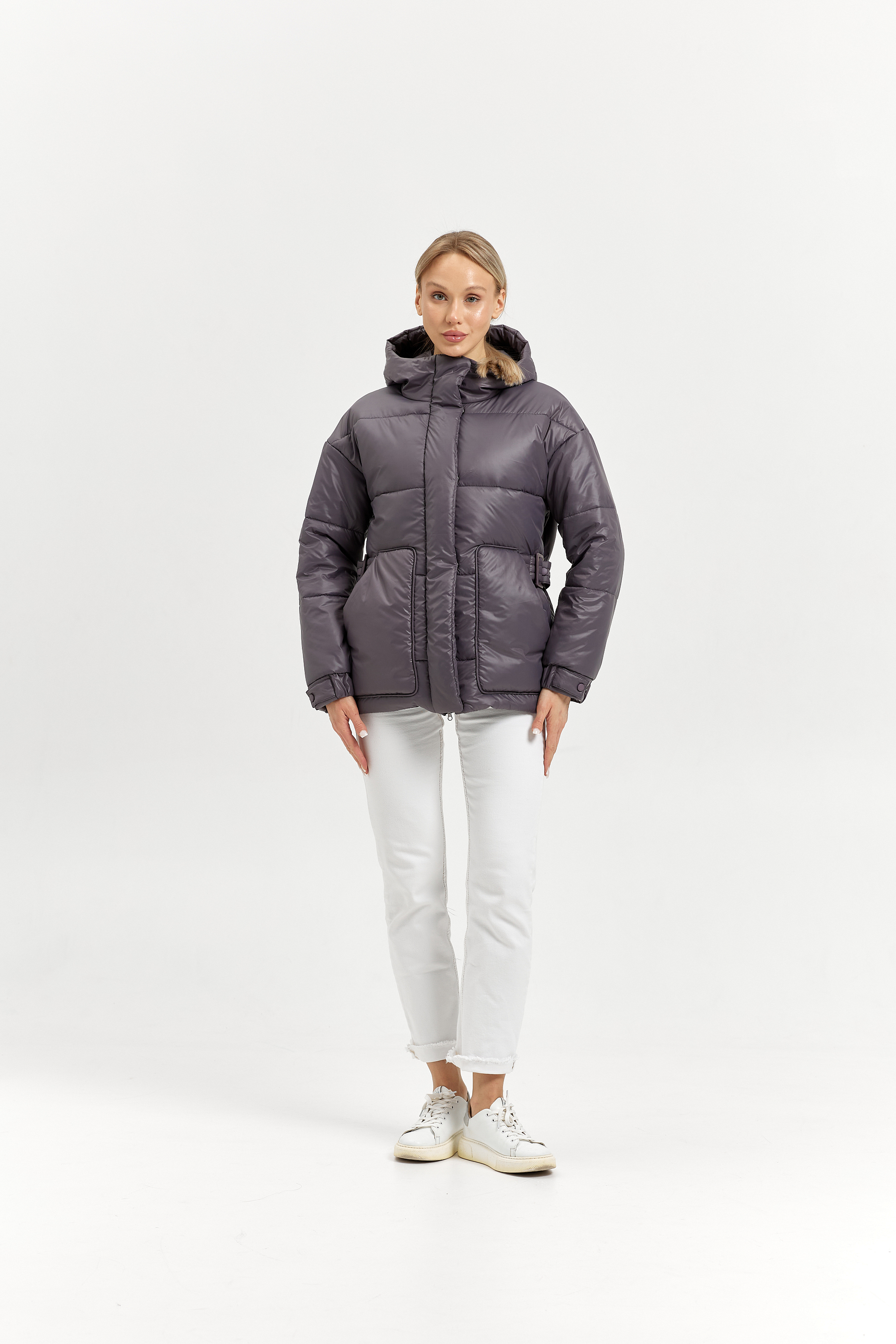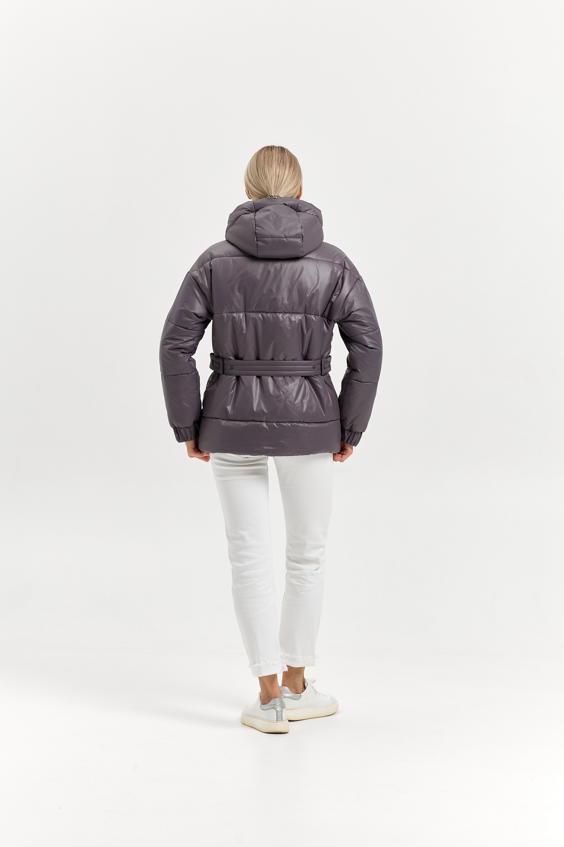 Пояс передний с пряжкой, выходит из-под кармана. Пояс спинки на кнопках регулирует объем талии.