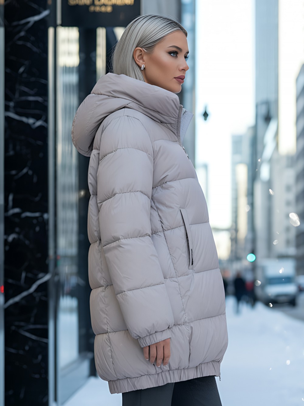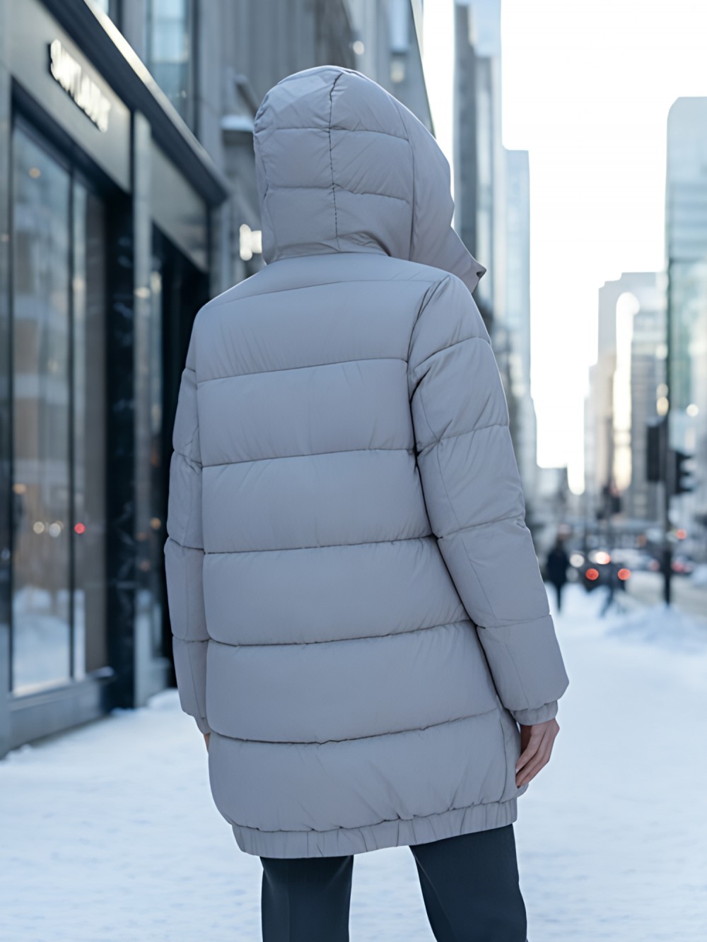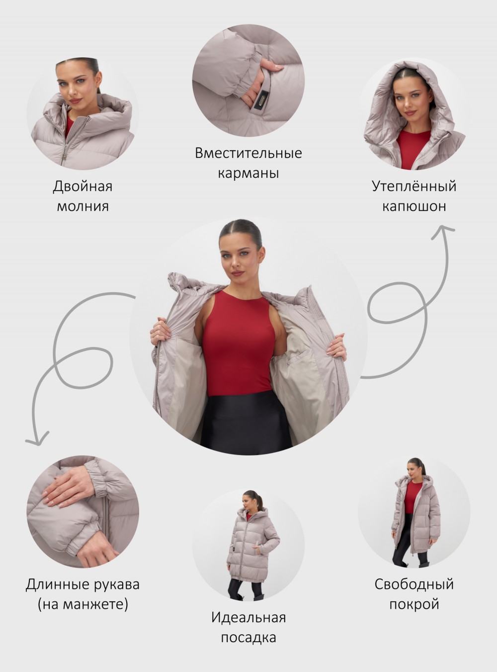 Дополнительные преимущества включают внутренние карманы для удобства, а также дышащий и гипоаллергенный материал, который не вызывает дискомфорта. Съемный воротник и фиксатор на капюшоне добавляют модели элегантности и функциональности.