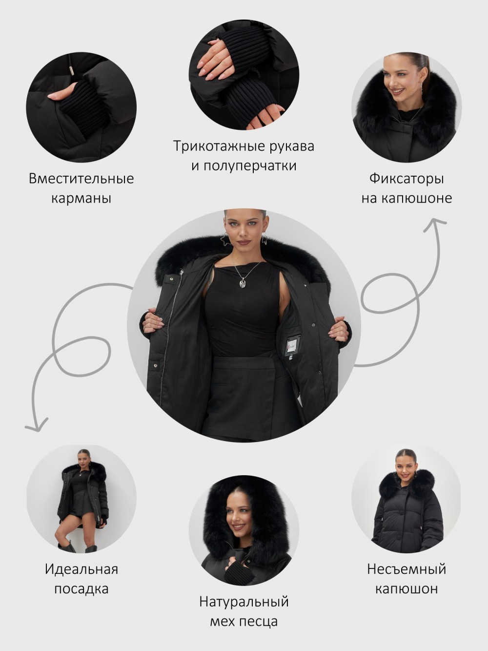 Декоративные элементы: Вырез для пальца, Манжеты, Заклепки, Мех