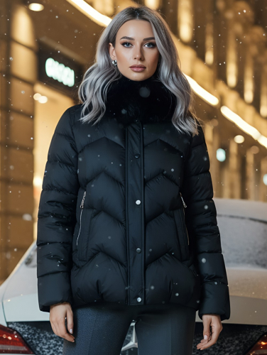 Куртка зимняя женская с мехом и капюшоном тренд черного цвета 7759Ch