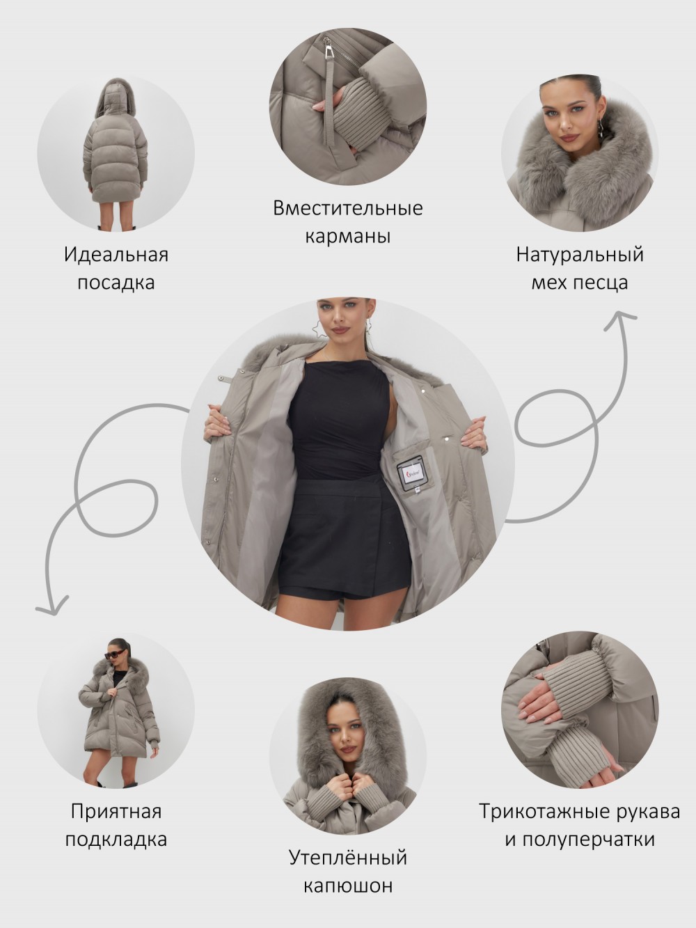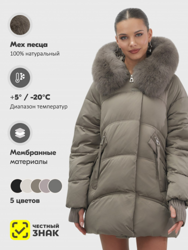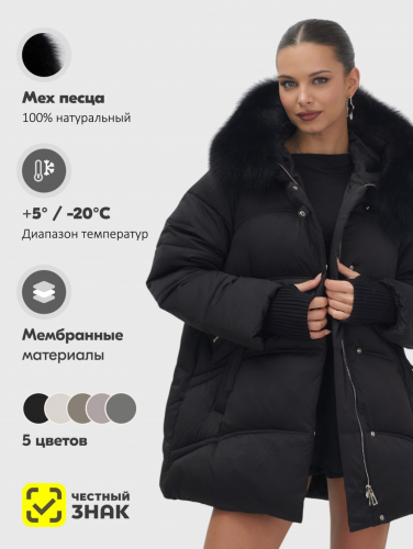 Пять трендовых оттенков сезона осень-зима 2025 – глубокий черный, благородный коричневый, нежный светло-коричневый, изысканный темно-зеленый и элегантный бежевый – идеально сочетаются с роскошным мехом песца. Удлиненный силуэт до колена и свободный крой создают идеальные пропорции для размеров 46-54.