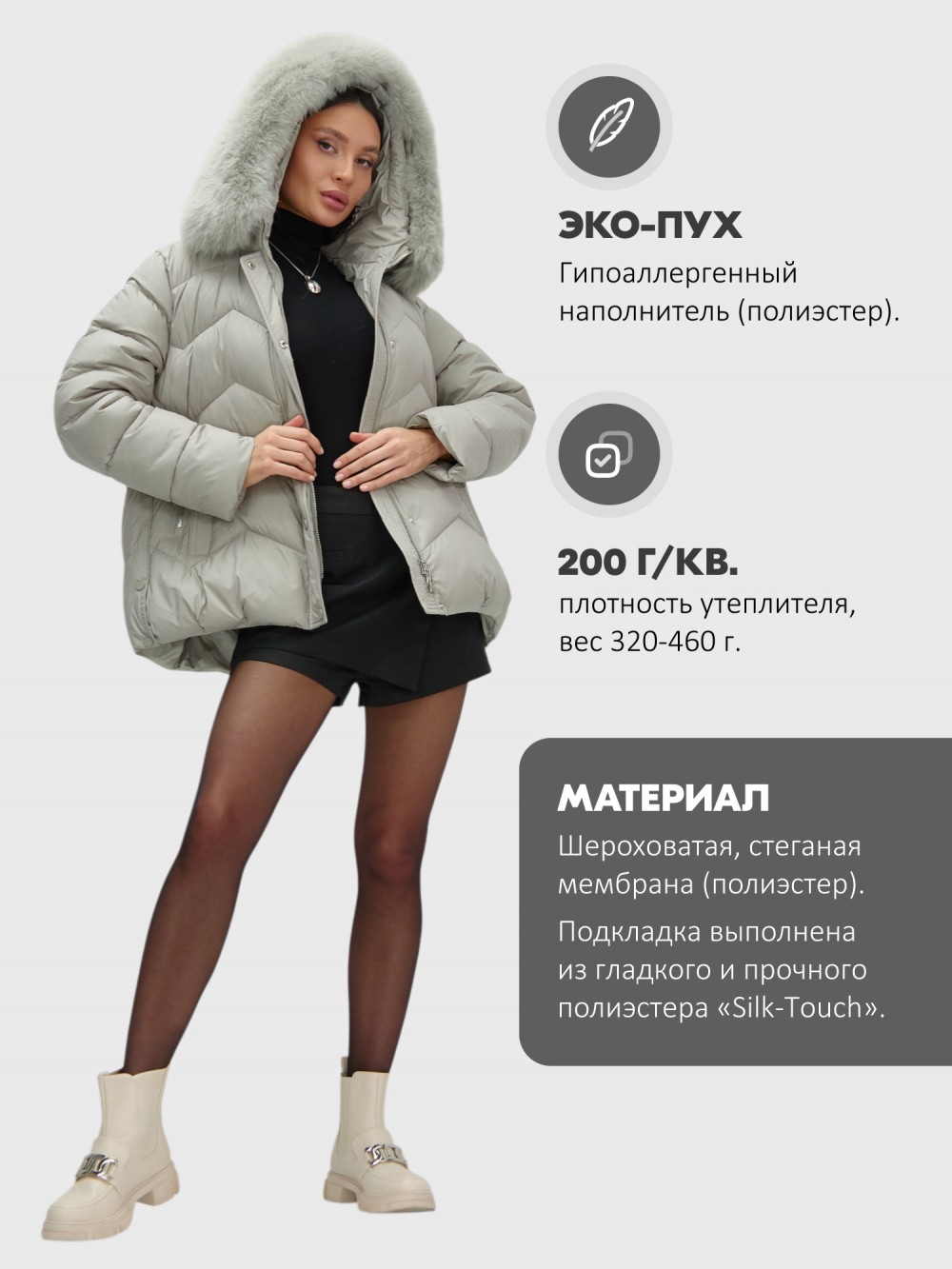 Особенности модели: быстросохнущая, ветрозащита, водоотталкивающий материал, гипоаллергенный материал, дышащий материал, съемная опушка