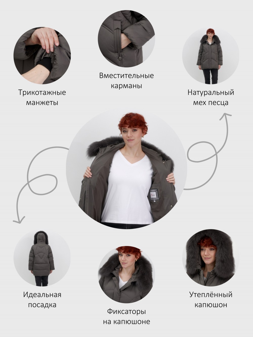 Декоративные элементы: Капюшон, Манжеты, Карманы, Мех