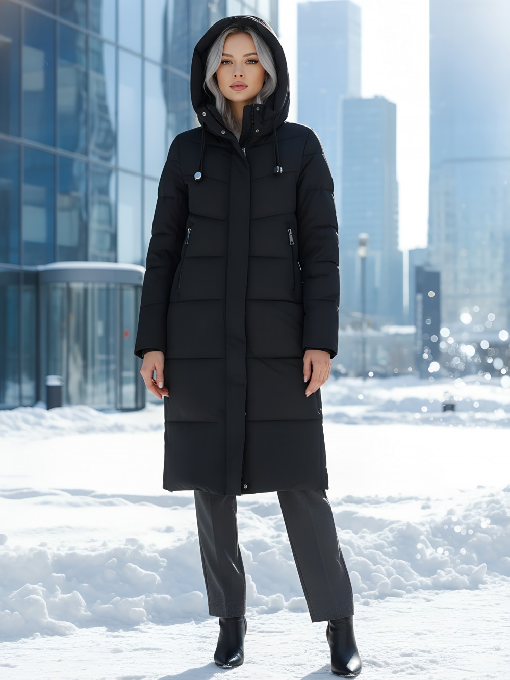 Эргономичный дизайн: Прямой крой ниже колена создает элегантный силуэт, а стеганая фактура добавляет изюминку. Несъемный капюшон с фиксаторами и ветрозащитная планка на кнопках защитят от пронизывающего ветра.