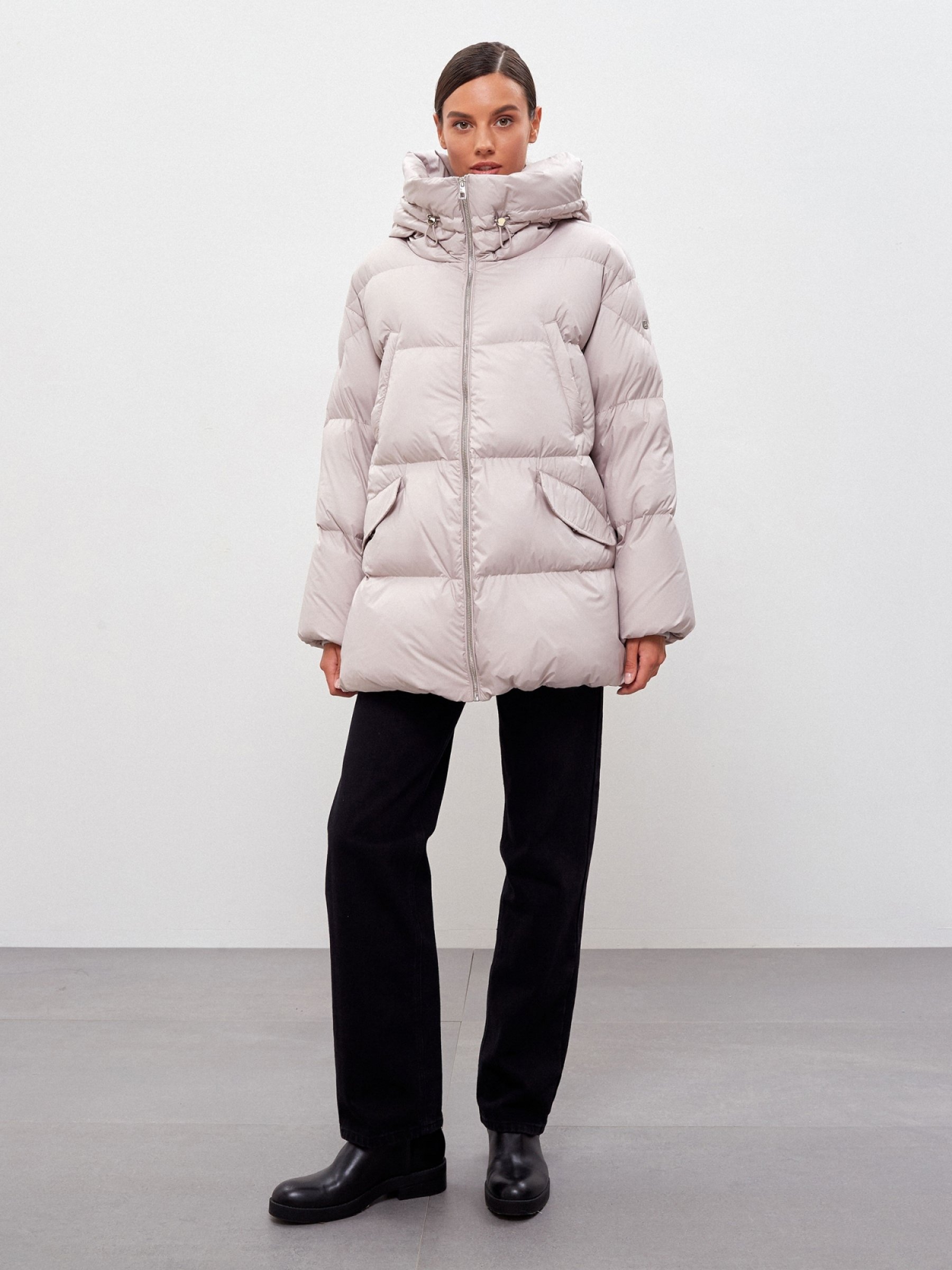 Объемная пуховая куртка свободного расклешенного кроя со спущенной линией плеча и высоким воротником-стойкой, а также рукавами комфортной ширины и застежкой на молнию. Боковые врезные карманы с клапанами на потайных кнопках, нагрудные карманы - на молнии. Куртка дополнена несъемным капюшоном, который может трансформироваться в объемный воротник-стойку и широкими манжетами из трикотажа в рубчик, обрамляющими рукава и защищающие Вас от ветра. По низу куртки предусмотрена кулиска. Актуальная модель займет законное место в сезонном гардеробе отъявленных модниц. В дуэте с курткой можно смело надевать узкие брюки-дудочки, прямые модели со стрелками или широкие, расклешенные от бедра модели.