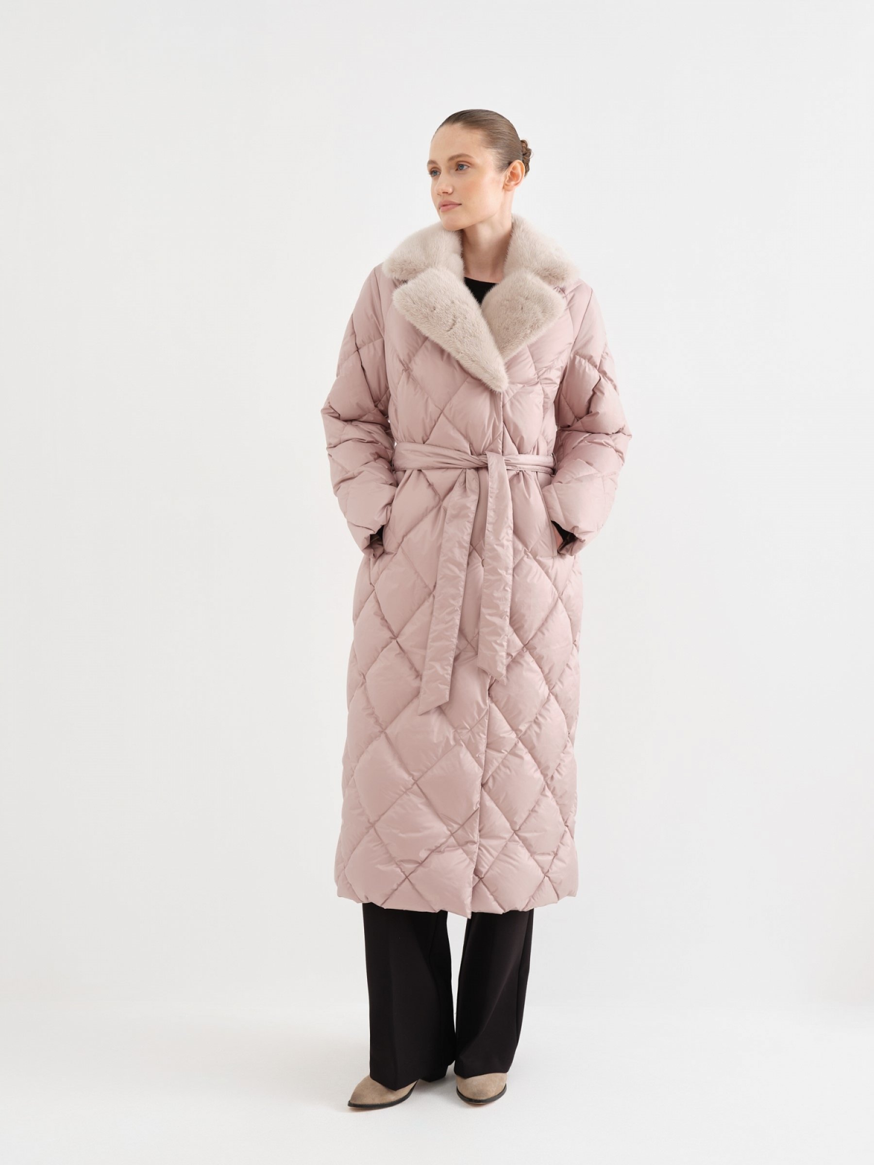 Пуховое пальто классической архитектуры сыграет в унисон с выдержанными повседневными комплектами. Съемный отложной воротник из окрашенной норки вносит изысканную ноту. Эта деталь не только украшает изделие, но и дополнительно утепляет верхнюю часть. Вторая интересная особенность – трендовая динамичная ромбовидная стежка. Пальто выполнено из плотной матовой ткани с водоотталкивающей пропиткой и утеплено отборным гусиным пухом и пером, поэтому отлично согревает до -30 градусов. В комплекте пояс, чтобы подчеркнуть талию. 100% полиэстер Подклад: 100% полиэстер Наполнит: 90% пух, 10% перо