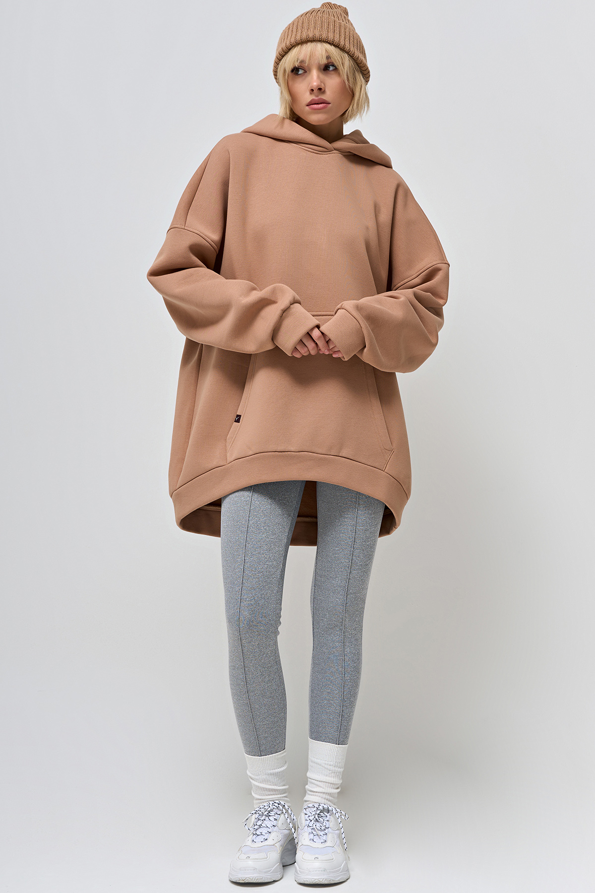 • Особенности: Худи силуэта Oversize из футера с начесом. Детали: объемный капюшон, спущенная линия проймы, широкий рукав с притачной манжетой, накладной карман по переду, по низу притачной пояс с небольшой посадкой, линия низа с удлиннением по спинке. Без застежки.