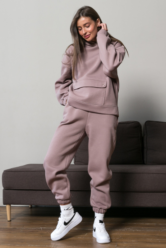 • Особенности: Костюм из свитшота с брюками из футера с начесом. Детали свитшота: капюшон на подкладке, спущенная линия плеча, втачной широкий рукав с манжетой, манжета из футера со сборкой на резину, накладной карман с клапаном с застежкой на кнопки по переду, притачной пояс по низу свитшота из футера. Детали брюк: брюки свободного кроя с манжетами по низу, манжеты из футера со сборкой на резинку, притачной пояс из футера с резиной, боковые карманы.