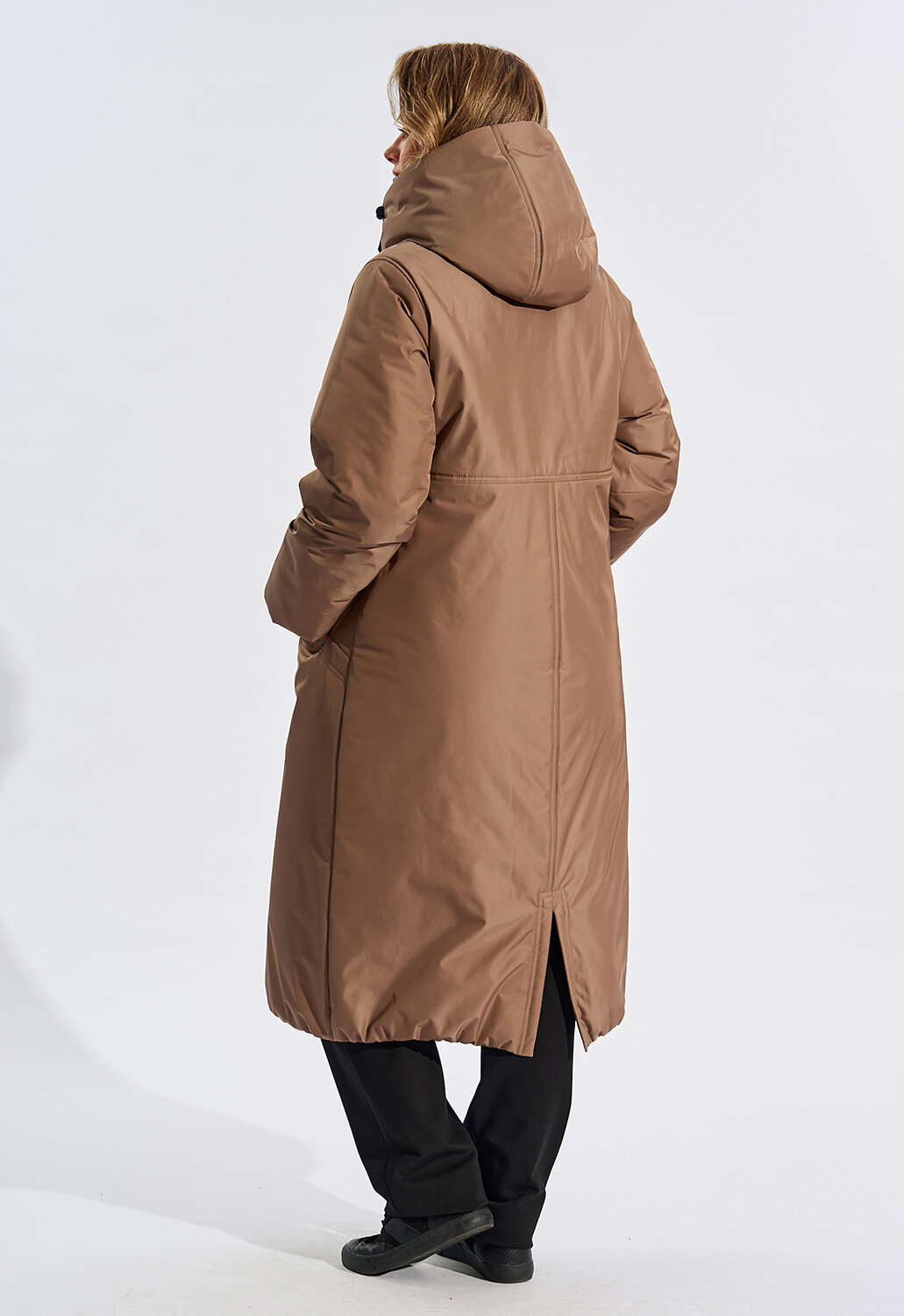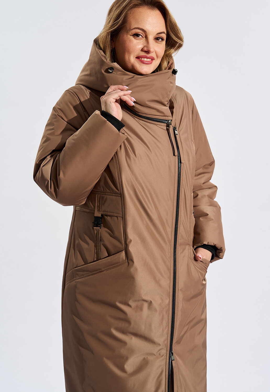 Зимнее пальто с водоотталкивающей пропиткой с утеплителем нового поколения ТермМакс. Функциональная застежка на двухзамковую молнию с внутренним ветрозащитным клапаном. Воротник-стойка на декоративных замках, частично расстегивающихся и преобразовывающих стойку в отложной воротник, который переходит в несъемный капюшон со шнурком. Рукава с трикотажной черной манжетой. Пальто с карманами с листочками в фигурном шве, вертикально вверх переходящие в дополнительные функциональные карманы на карабинах.