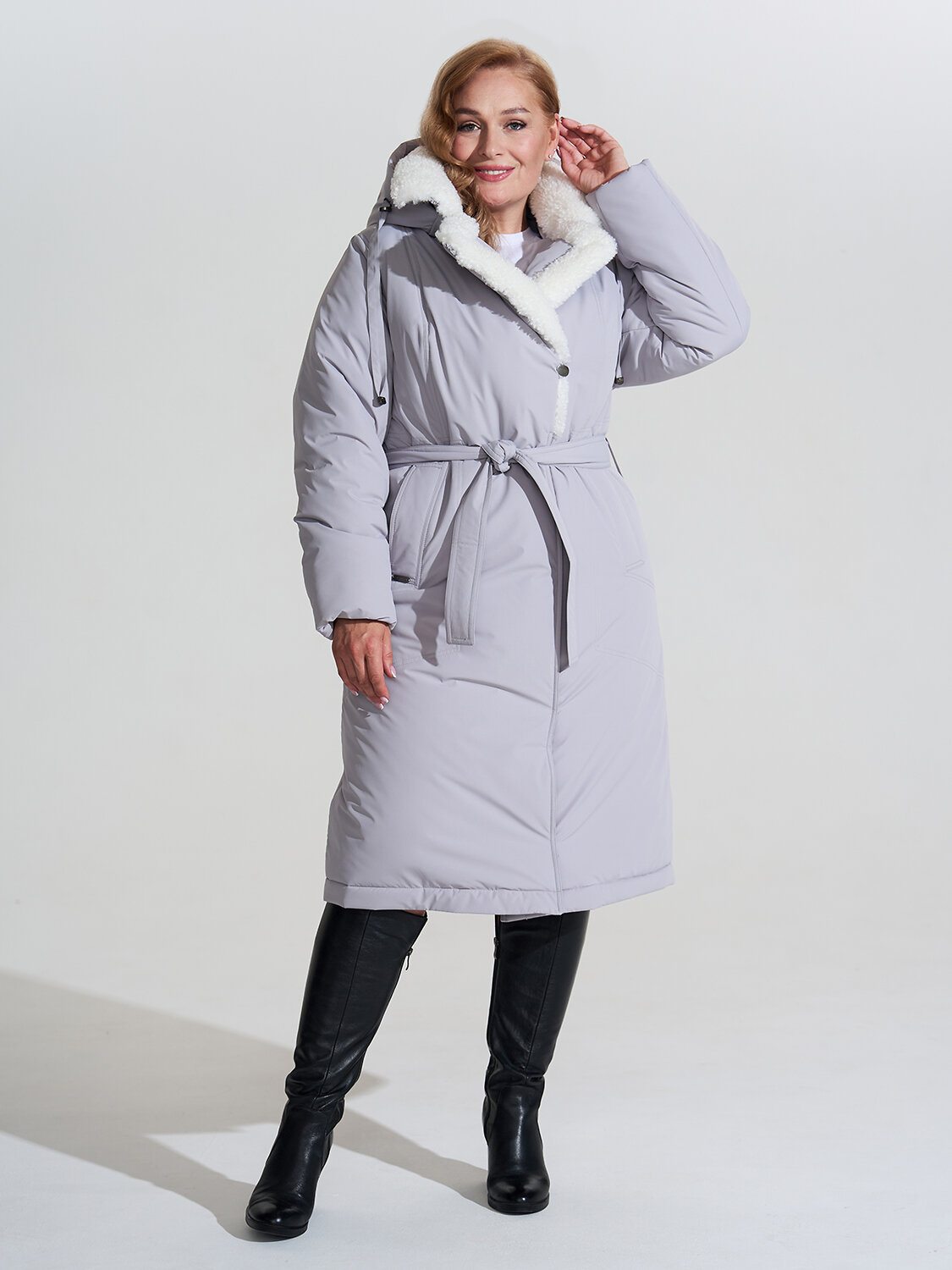 Модель почти прямого силуэта. Застежка на двух замковую молнию и кнопки. Пальто можно носить как с поясом, так и без. Лацканы и воротник отделаны высококачественным Эко мехом почти белого цвета, что очень освежает. Застежка продумана идеально, дополнительные пуговицы помогают полностью закрыть горловину, что придаёт этой модели дополнительную функциональность, защищая от ветра, дождя и снега. Капюшон отстегивается, затягивается кулиской. Внутренние трикотажные манжеты на рукавах обеспечивают дополнительную теплозащиту. В нашем пальто вам всегда будет комфортно и очень тепло!