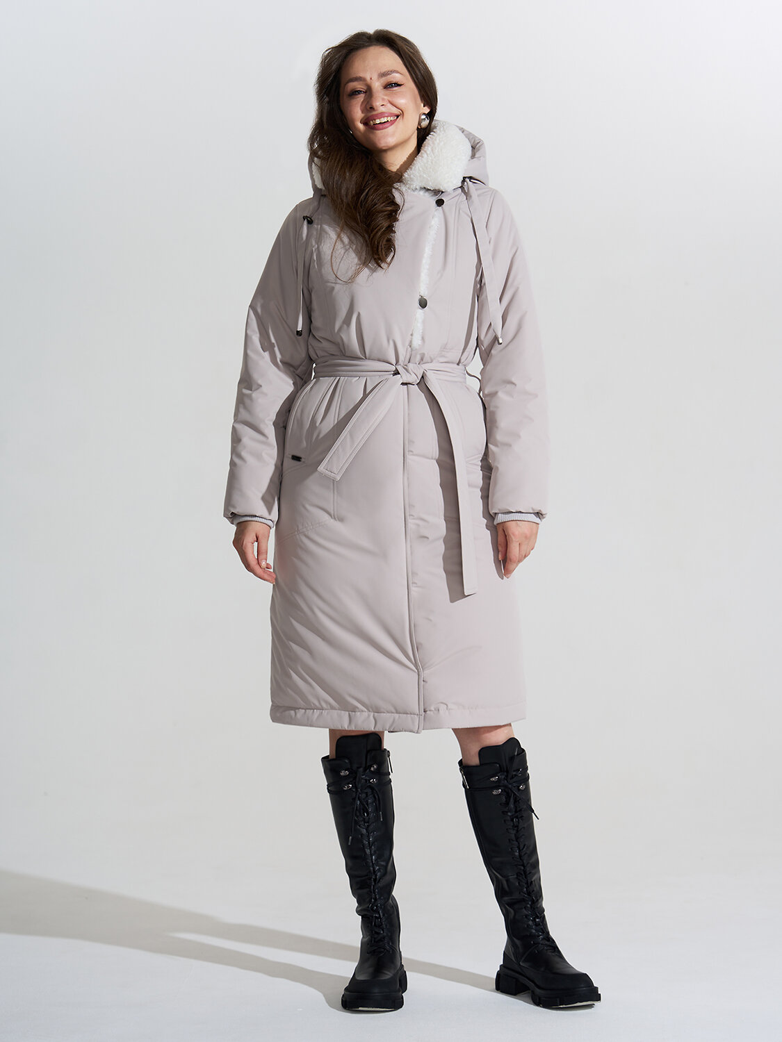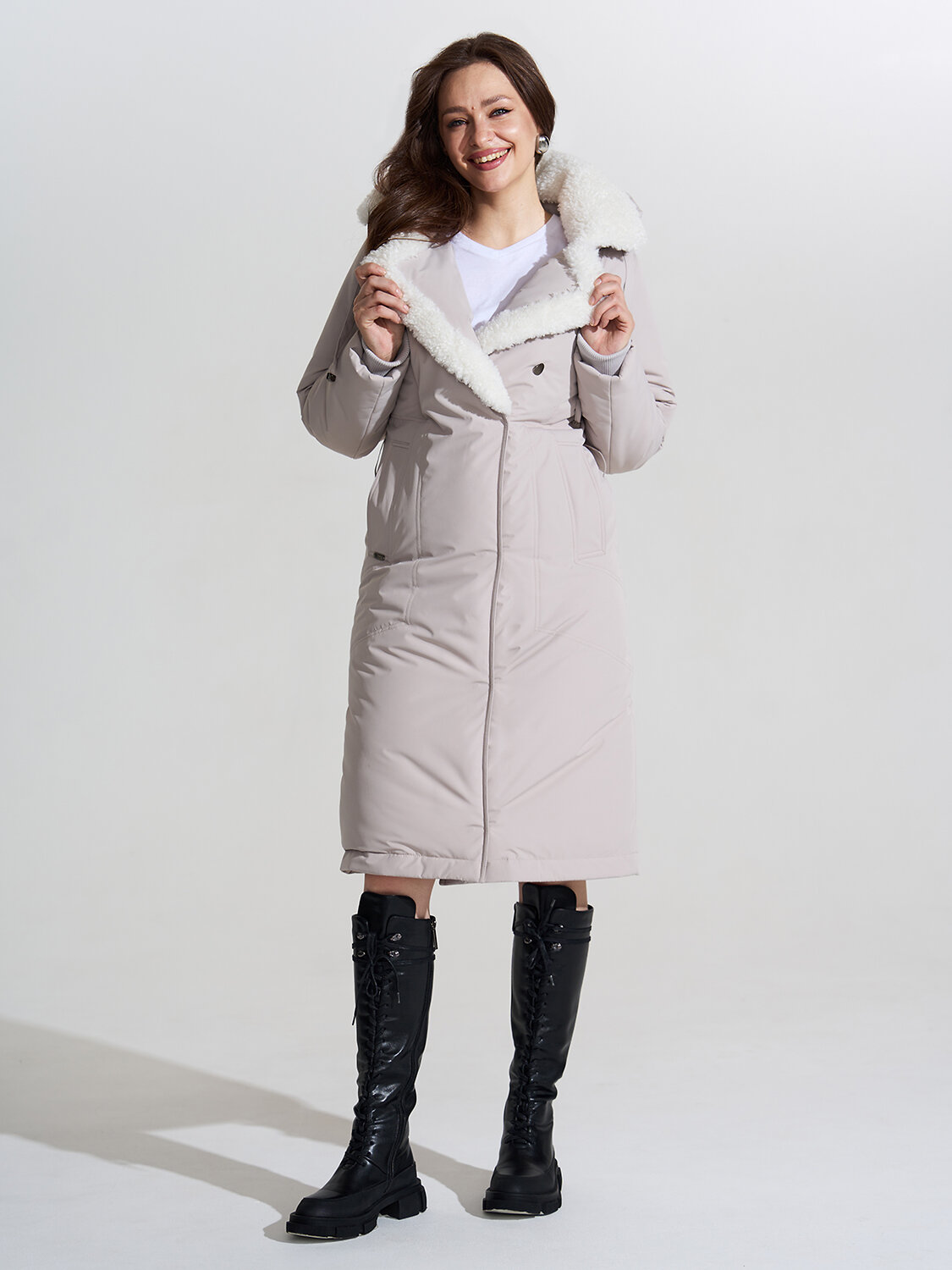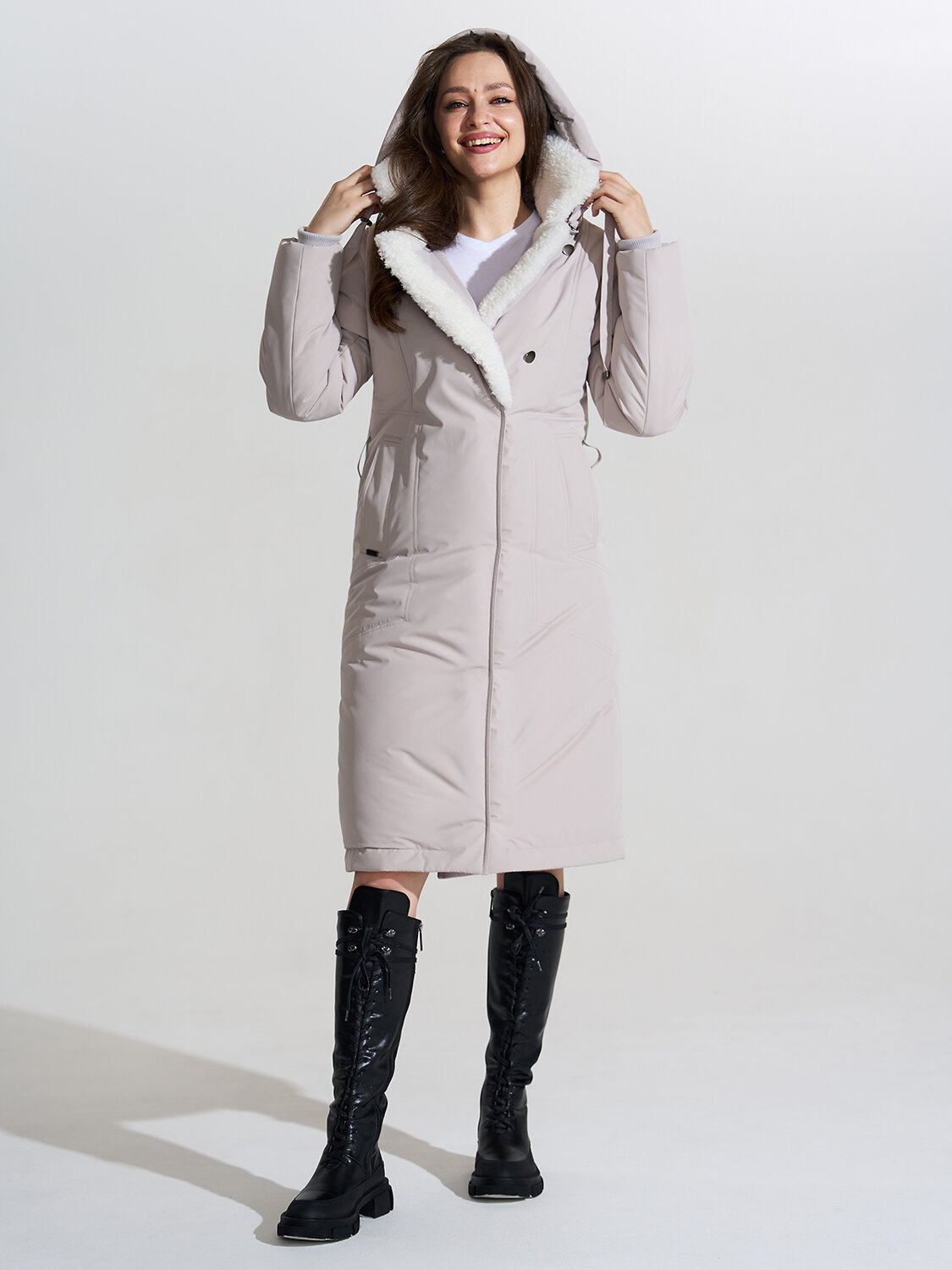 Модель почти прямого силуэта. Застежка на двух замковую молнию и кнопки. Пальто можно носить как с поясом, так и без. Лацканы и воротник отделаны высококачественным Эко мехом почти белого цвета, что очень освежает. Застежка продумана идеально, дополнительные пуговицы помогают полностью закрыть горловину, что придаёт этой модели дополнительную функциональность, защищая от ветра, дождя и снега. Капюшон отстегивается, затягивается кулиской. Внутренние трикотажные манжеты на рукавах обеспечивают дополнительную теплозащиту. В нашем пальто вам всегда будет комфортно и очень тепло!