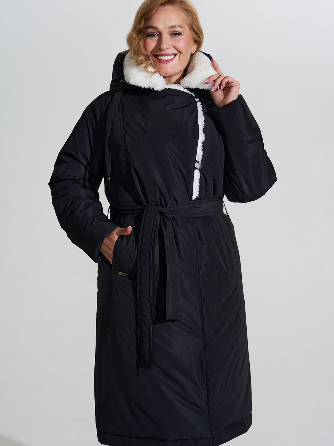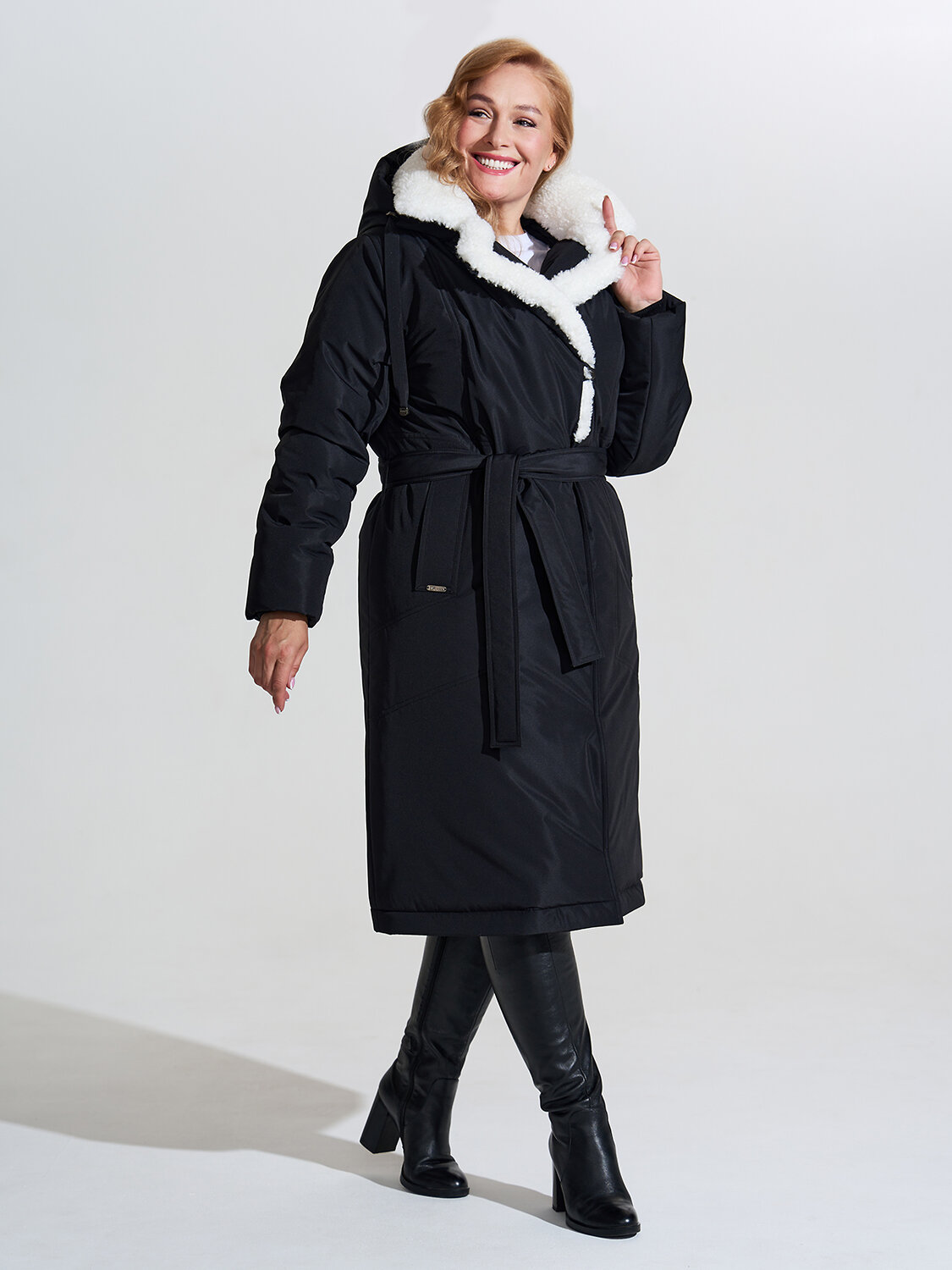 Модель почти прямого силуэта. Застежка на двух замковую молнию и кнопки. Пальто можно носить как с поясом, так и без. Лацканы и воротник отделаны высококачественным Эко мехом почти белого цвета, что очень освежает. Застежка продумана идеально, дополнительные пуговицы помогают полностью закрыть горловину, что придаёт этой модели дополнительную функциональность, защищая от ветра, дождя и снега. Капюшон отстегивается, затягивается кулиской. Внутренние трикотажные манжеты на рукавах обеспечивают дополнительную теплозащиту. В нашем пальто вам всегда будет комфортно и очень тепло!