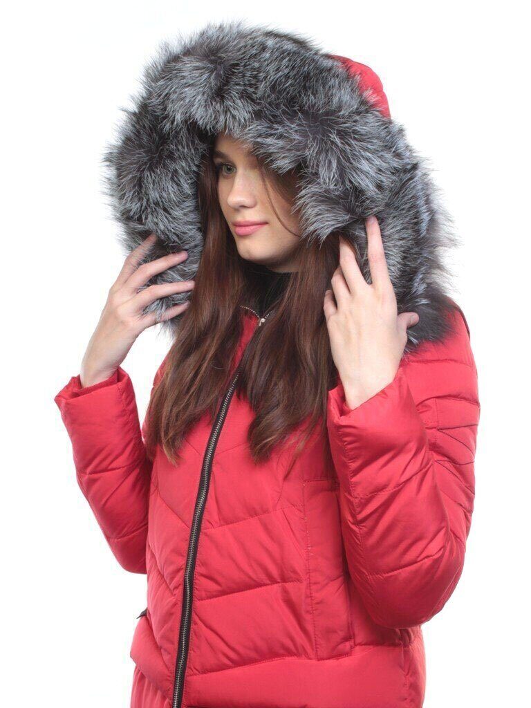 Капюшон (несъемный), регулируется шнурком, натуральный мех чернобурки (съемный).