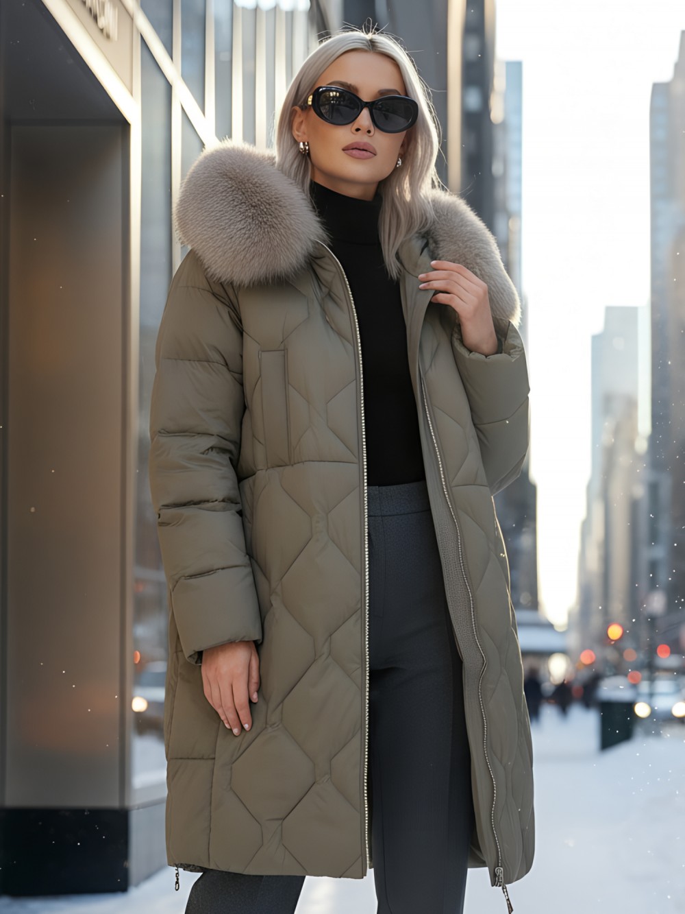 Пять благородных оттенков коллекции осень-зима 2025 – глубокий черный, роскошный коричневый, изысканный светло-коричневый, элегантный темно-коричневый и благородный темно-зеленый – великолепно сочетаются с натуральным мехом песца. Удлиненный силуэт до колена и свободный крой идеальны для размеров 48-56.