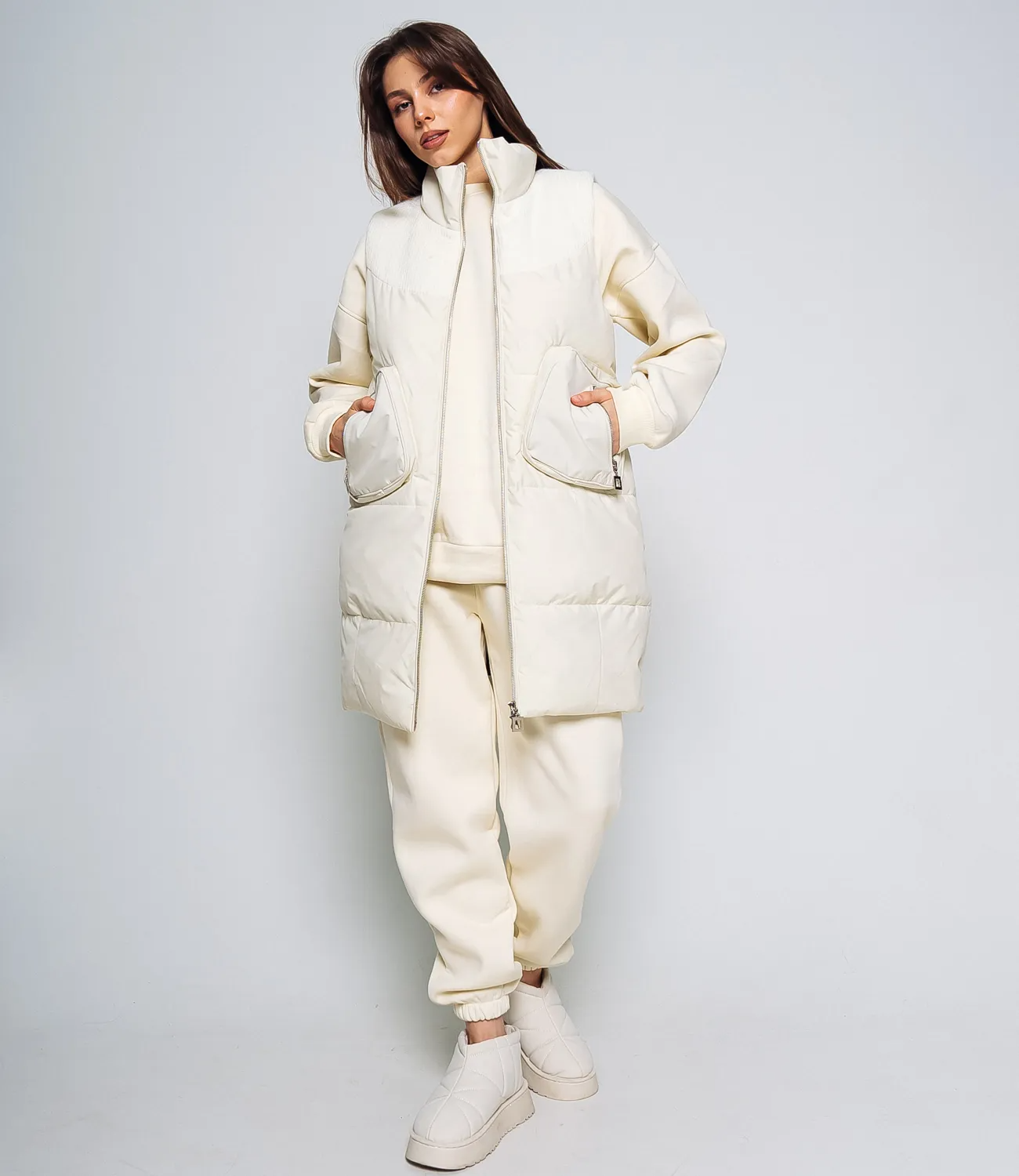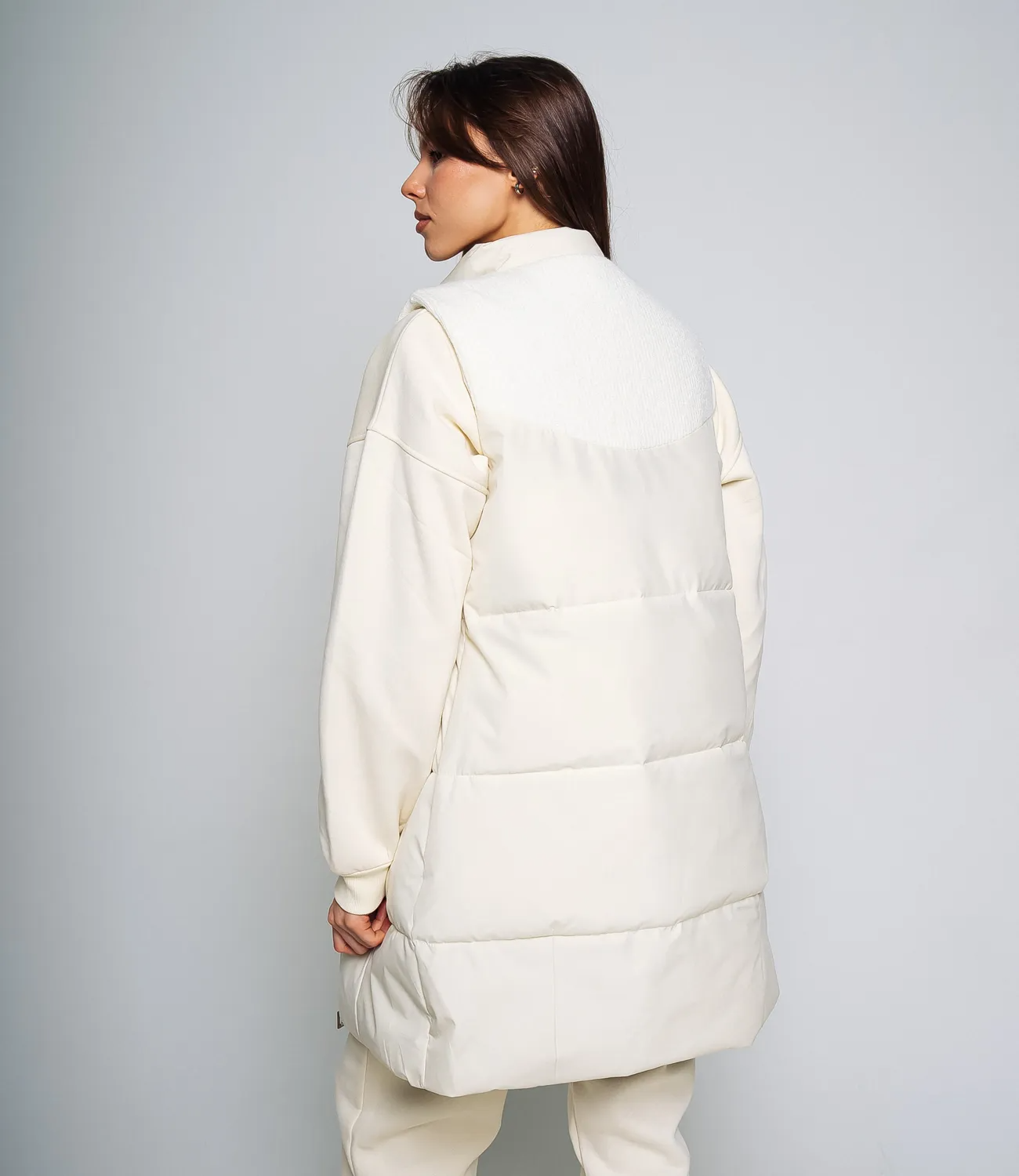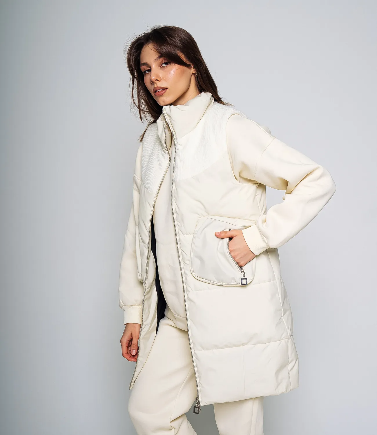 Удлиненный жилет с тканевой вставкой - теплое решение для прохладной погоды.