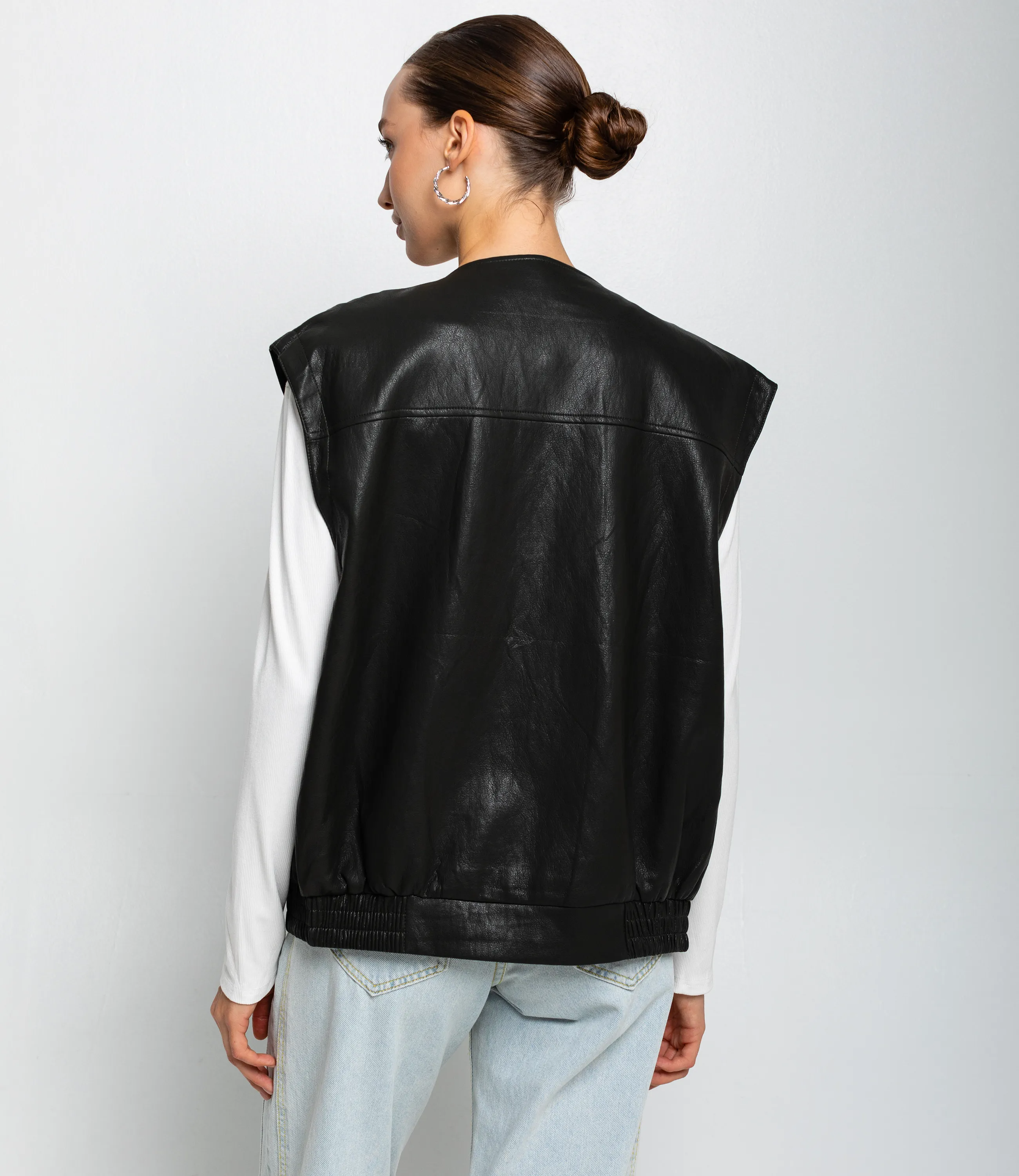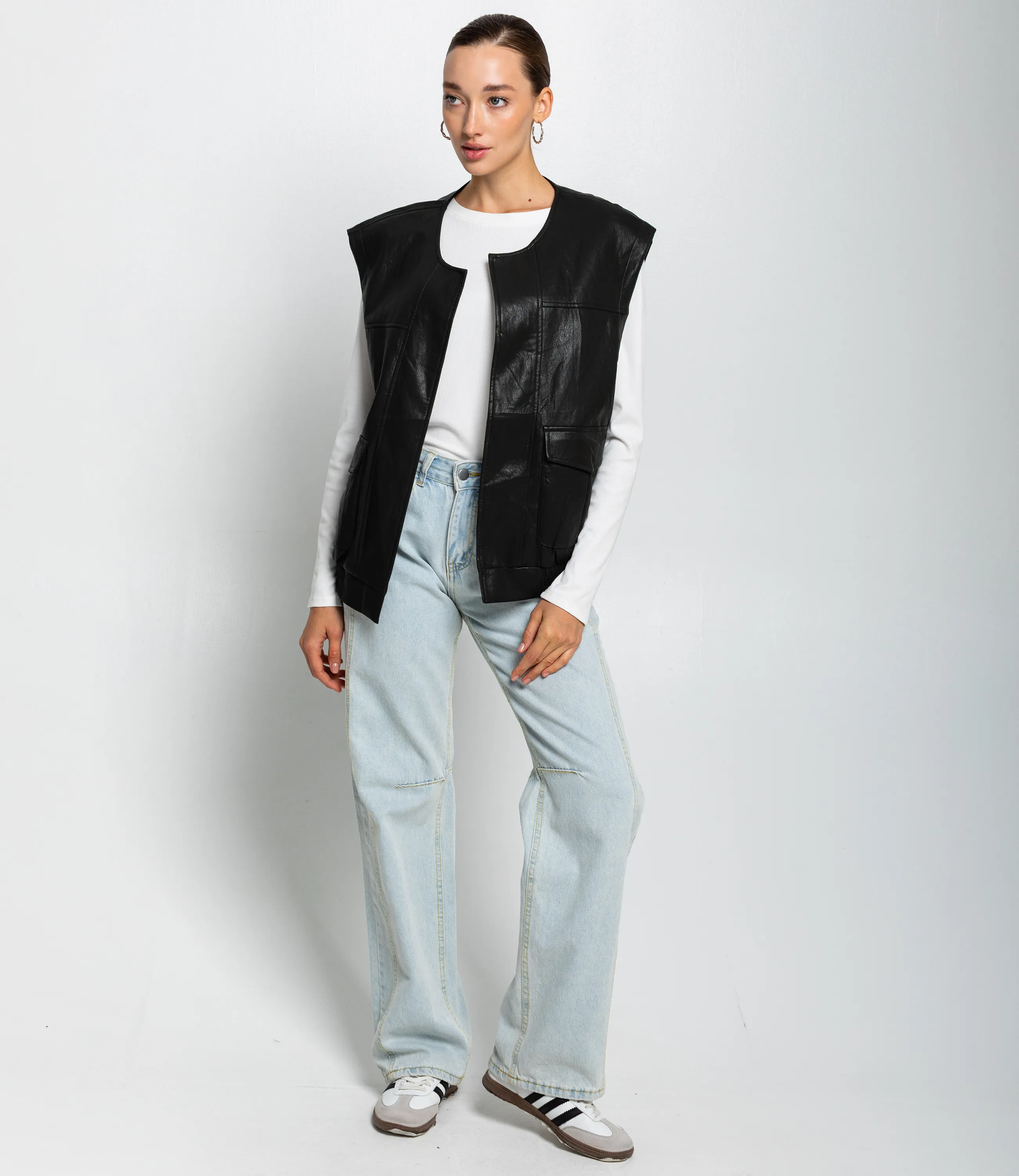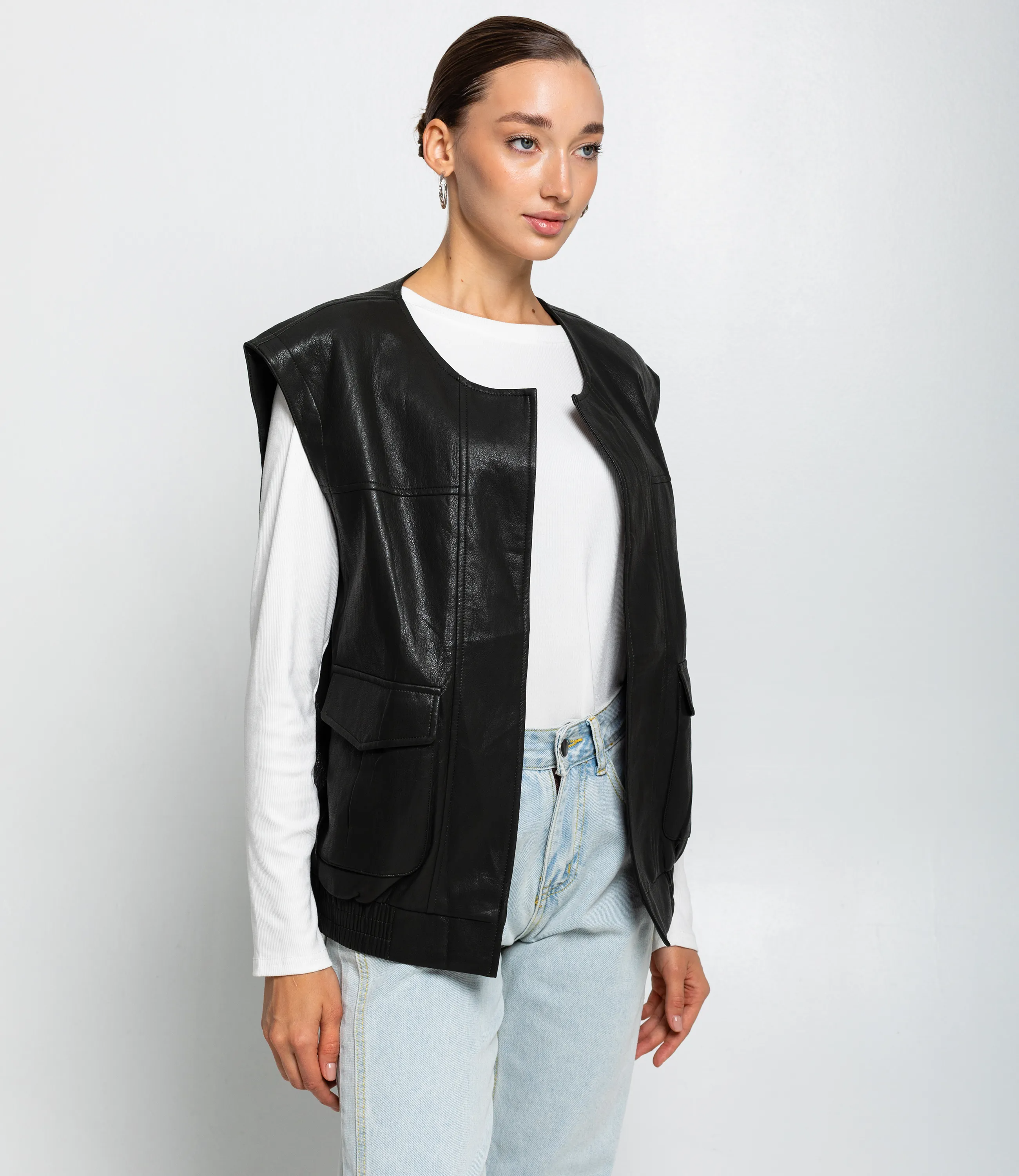 Жилет – это одежда, которая подчеркивает привлекательность каждой женщины. Этот жилет выполнен из ткани, состоящей на 55% полиуретан и 45% вискозы. Модель с гладкой фактурой и строгим boxy‑силуэтом до бёдер, с выраженной плечевой линией и круглым вырезом без воротника; передняя часть открытая без видимой застёжки, украшена декоративными вертикальными и горизонтальными швами и нагрудными кокетками, по бокам расположены накладные карманы с клапанами, внизу присутствуют эластичные вставки для лучшей посадки — плотная, но гибкая кожа придаёт структуру и сохраняет форму, что делает жилет универсальным для кэжуал образа. Не откажите себе в удовольствии быть элегантной! Рост модели: 168, параметры: 85-63-92. Вы можете заказать онлайн презентацию на интересующие Вас модели. Наши менеджеры свяжутся с Вами и проведут индивидуальную видеотрансляцию, помогут составить заказ и ответят на Ваши вопросы.