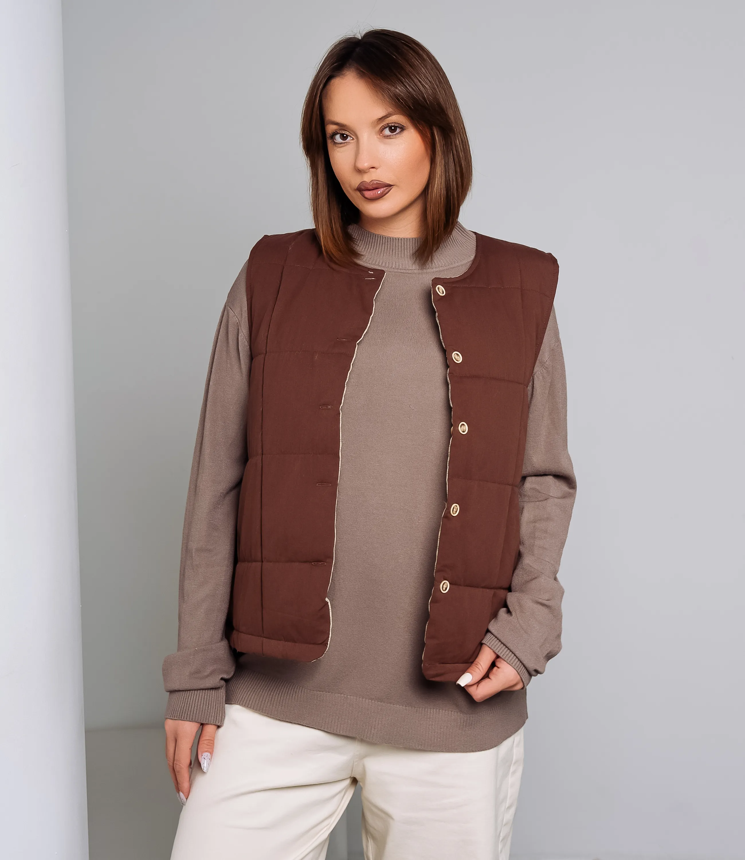 Жилетка – это одежда, которая подчеркивает уникальность каждой представительницы прекрасного пола. Джемпер выполнен из плотного трикотажа средней плотности с равномерной гладкой текстурой; модель прямого свободного силуэта, создающая аккуратную, слегка расслабленную посадку. Горловина круглая, с невысокой стойкой, плотно прилегающая к шее. Плечевые швы смещены в естественное положение, рукава длинные, слегка расширенные по линии плеча и постепенно заужающиеся к запястью, где оформлены узкими манжетами в резинку, удерживающими форму. Корпус изделия отделан широкой планкой в резинку по низу, обеспечивающей аккуратную линию на бедрах; все кромки обработаны ровно, швы скрытые и аккуратные. Для изготовления жилетки использован 60% хлопок и 40% полиэстер, который характеризуется отличным качеством. Даже после многократных стирок изделие не утратит первоначальной привлекательности. Вы будете носить его с радостью. Обратите внимание на цвет, который является насыщенным и полностью соответствует фотографии на сайте. Чтобы вы были уверены в размере, мы представили на странице таблицу. Воспользовавшись ею, вы сможете сами обмерить себя и удостовериться. Установленная нами цена является приемлемой. Не откажите себе в удовольствии быть неповторимой!