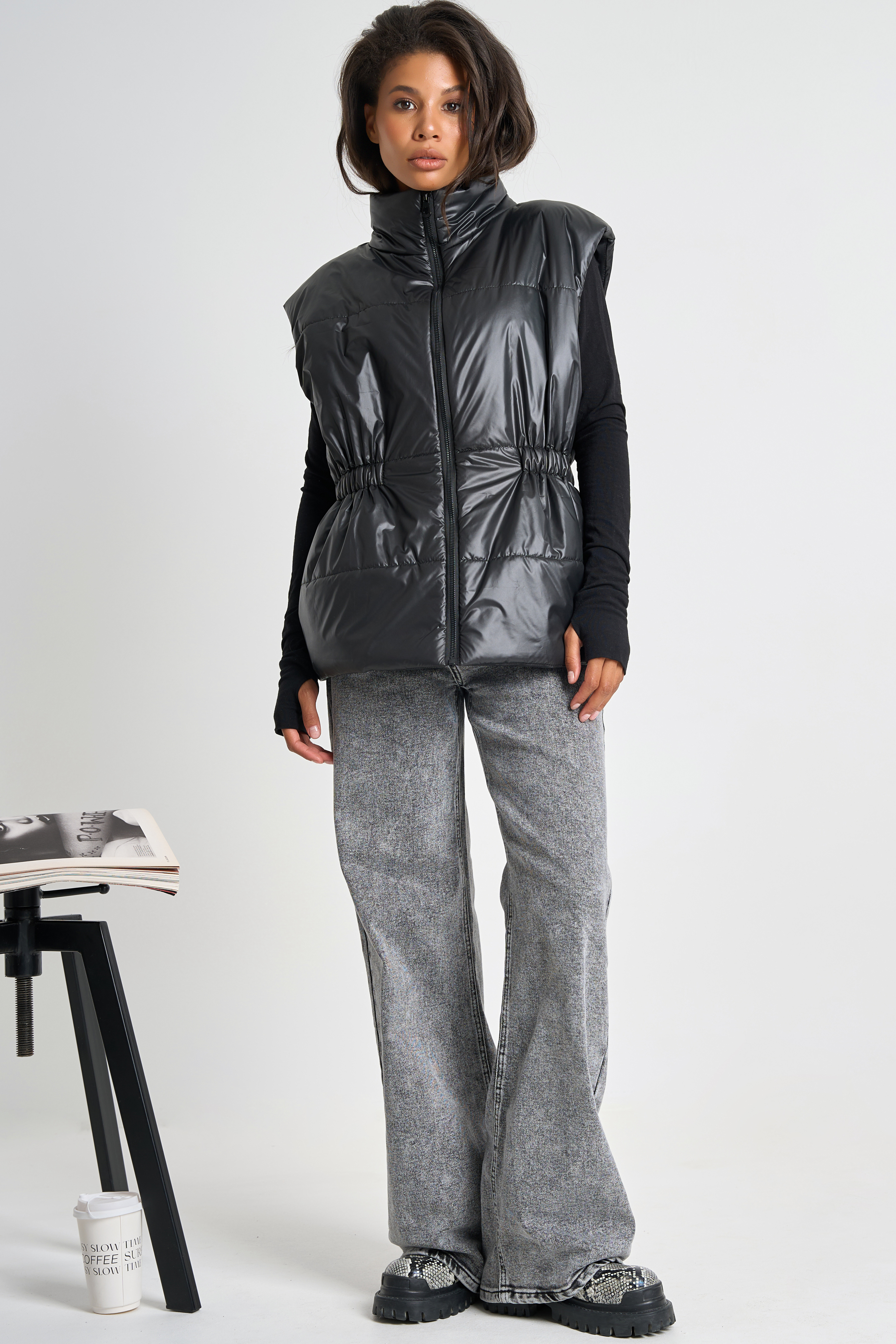 • Особенности: Утепленный жилет прямого силуэта из плащевой ткани.Ткань надежно защищает от неблагоприятных погодных условий и имеет красивый выраженный блеск.  Детали: воротник-стойка, спущенное плечо, карманы в боковых швах, застежка на молнию.