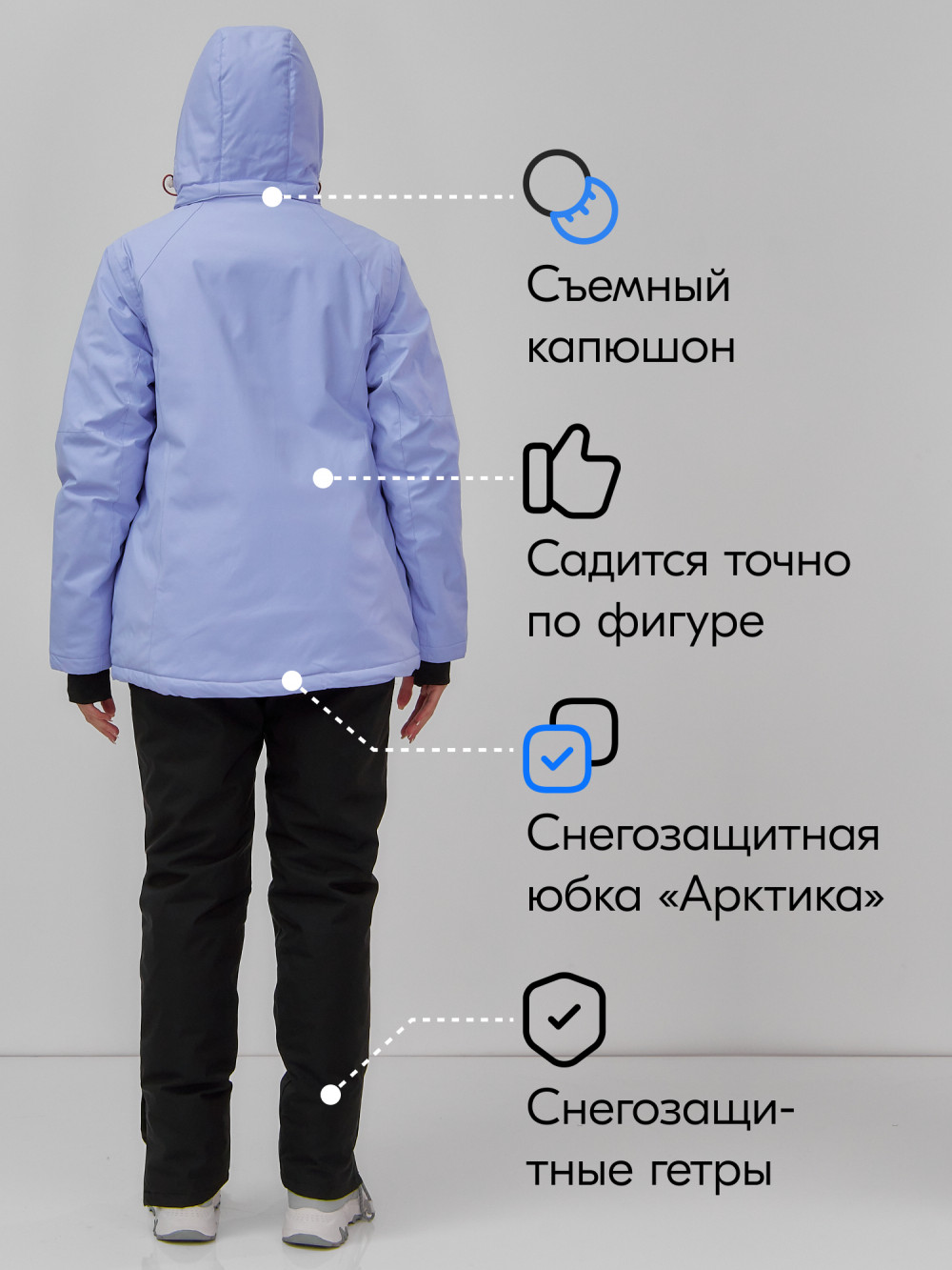 • Утягивающий фиксатор на молнии и снегозащитные гамаши с антискользящей резинкой гарантируют защиту от снега.