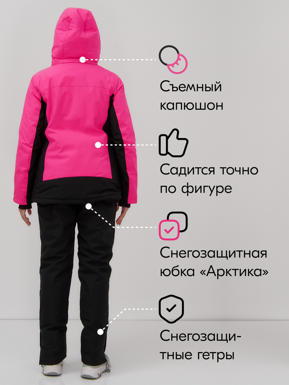 • Изысканный дизайн: Приталенный крой, стильные декоративные элементы и современная цветовая палитра сделают вас центром внимания на фоне снежных склонов.