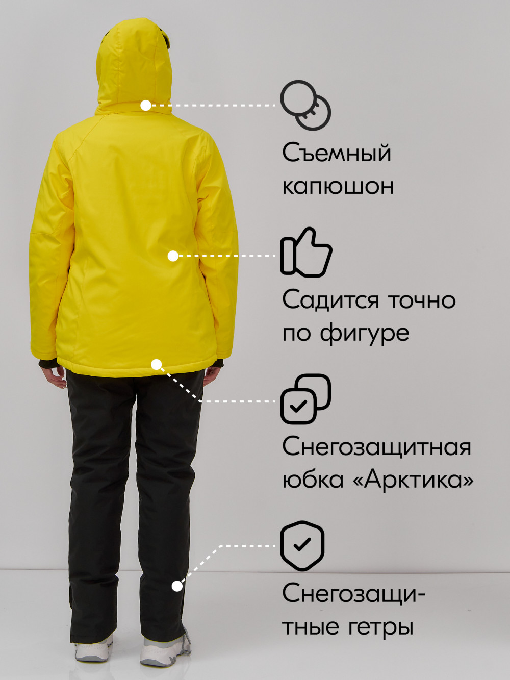 • Утягивающий фиксатор на молнии и снегозащитные гамаши с антискользящей резинкой гарантируют защиту от снега.