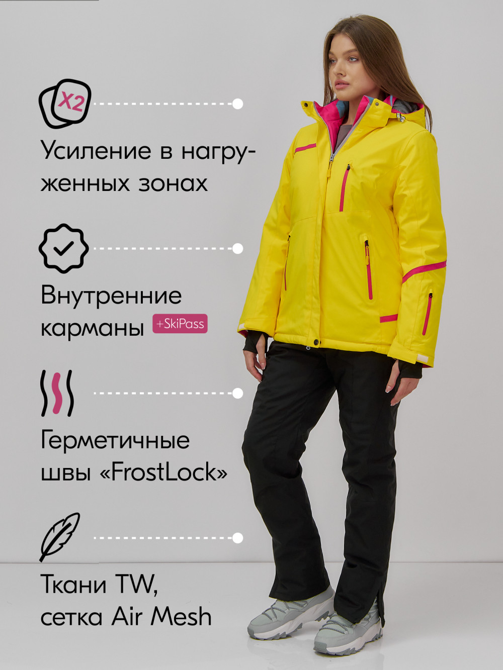 Горнолыжный костюм женский зимний желтого цвета 07091J