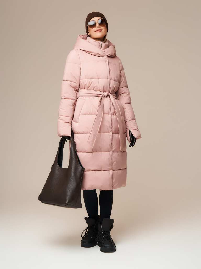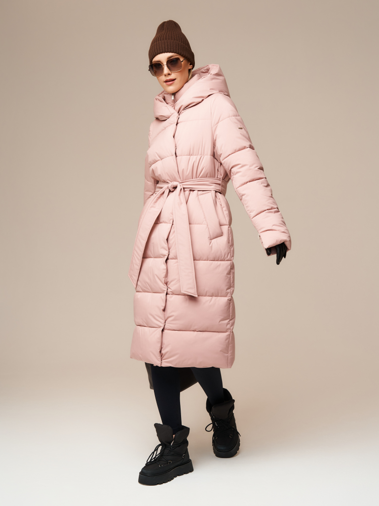 В комплекте идет пояс из основной ткани. Капюшон: не съемный, есть съемная манишка со стойкой.