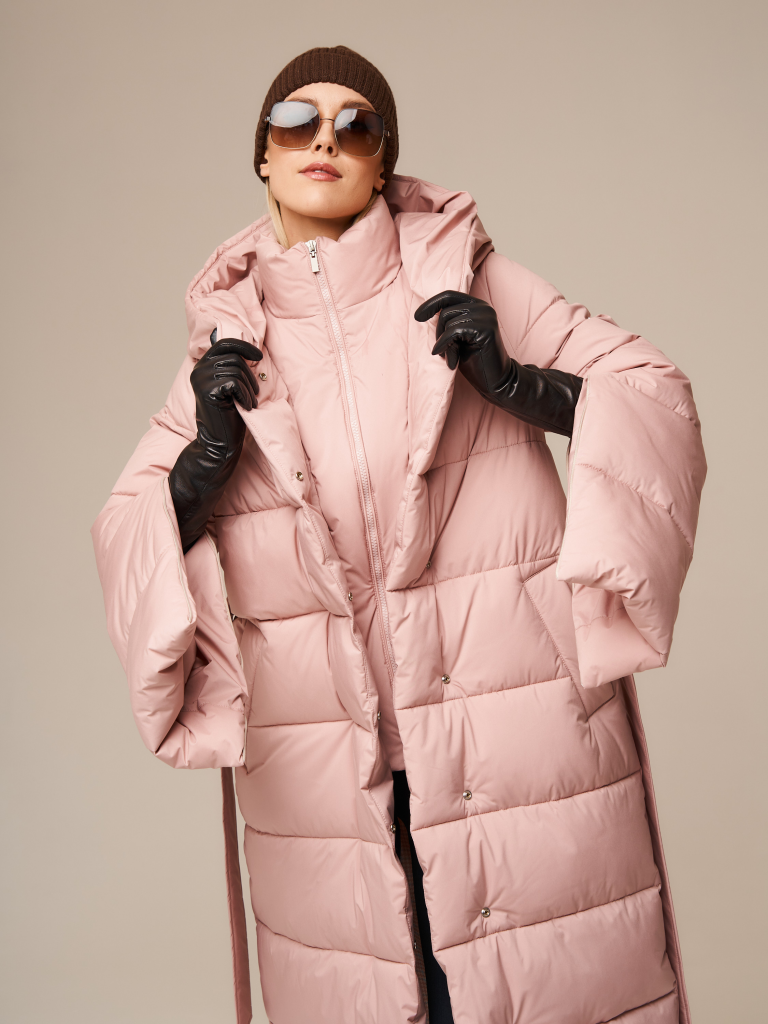 Модель имеет втачной рукав длиной 66 см и капюшон с дополнительной съемной манишкой со стойкой для защиты шеи от ветра и холода. Пуховик застегивается на молнию и потайные кнопки, а также оснащен потайными молниями на рукавах, что обеспечивает функциональность.