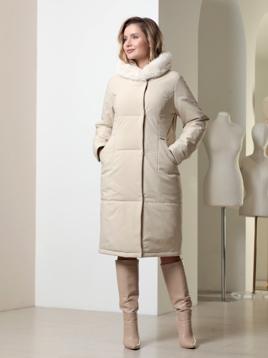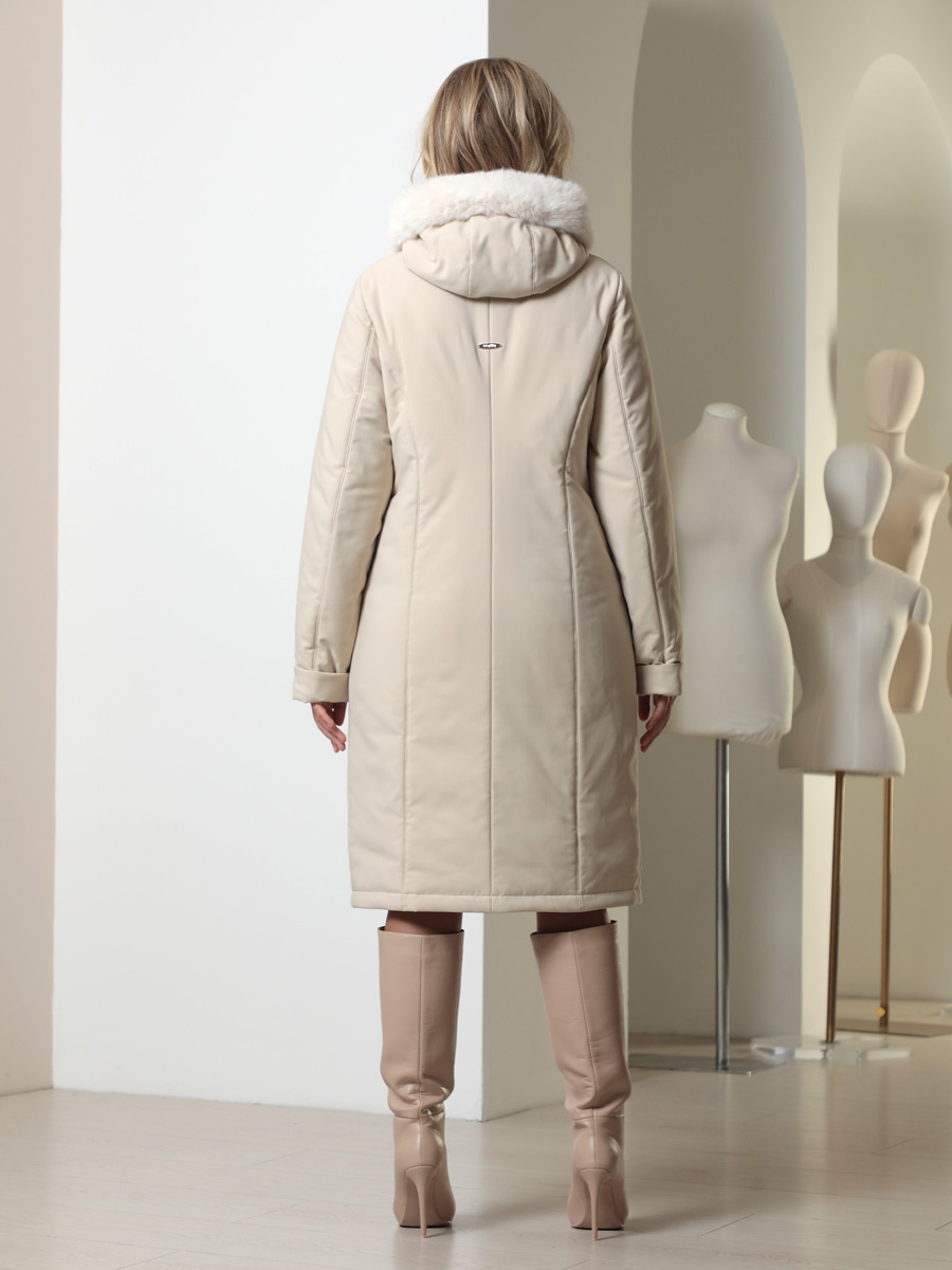 Стильное зимнее пальто средней длины полуприлегающего силуэта подходит для девушек и женщин разной возрастной категории, оно хорошо садится на любую фигуру. Отворот несъемного капюшона оформлен опушкой из приятного на ощупь искусственного меха, что добавляет элегантности образу. Мех не отстегивается, но хорошо стирается и не теряет свой красивый внешний вид после высыхания. Смещенная застежка в пальто двойная - на молнию и кнопки. Длину втачного рукава можно регулировать отворотом. Карманы в этой женственной модели пальто выполнены по типу накладных и предназначены для "мелочей". Есть внутренний кармашек на молнии. Плащевая ткань имеет водоотталкивающую пропитку, выдерживающую небольшой дождь, снег и ветер. Хорошо зарекомендовавший себя утеплитель " Холлофайбер", плотностью 300гр/м, защитит от холода. Подкладка в изделии - из ткани в мелкую полоску. Выбирайте понравившийся цвет, подбирайте аксессуары, и Ваша зима будет уютной, стильной и комфортной!