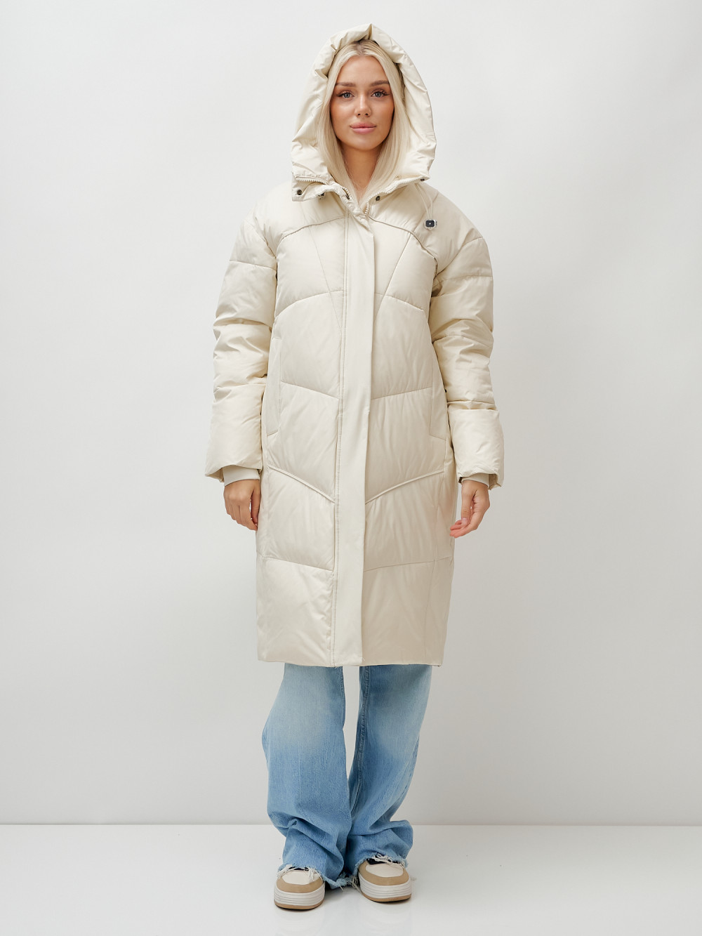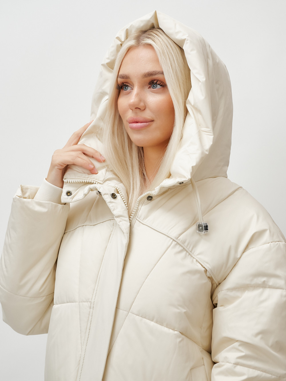 Пальто летучая мышь женское с капюшоном зимнее бежевого цвета 9616B