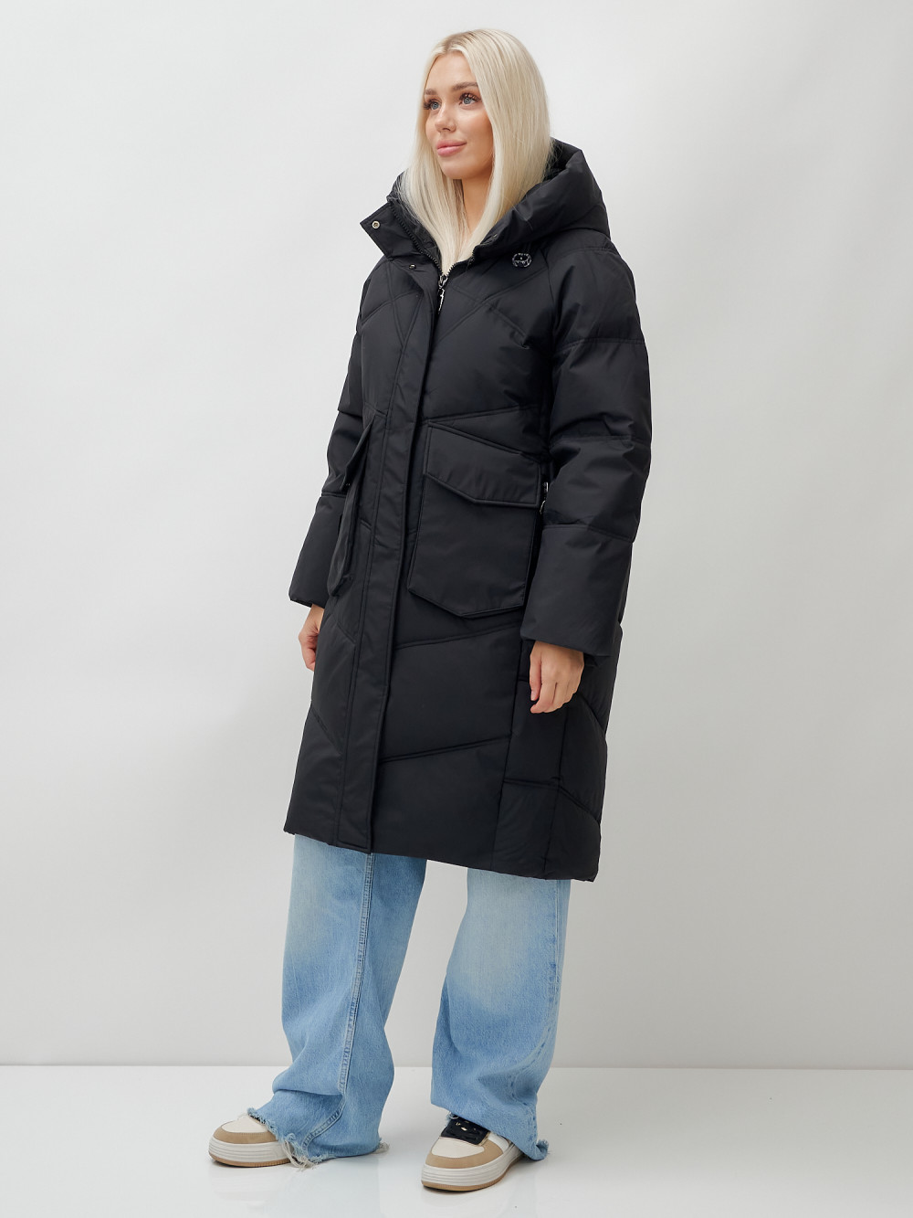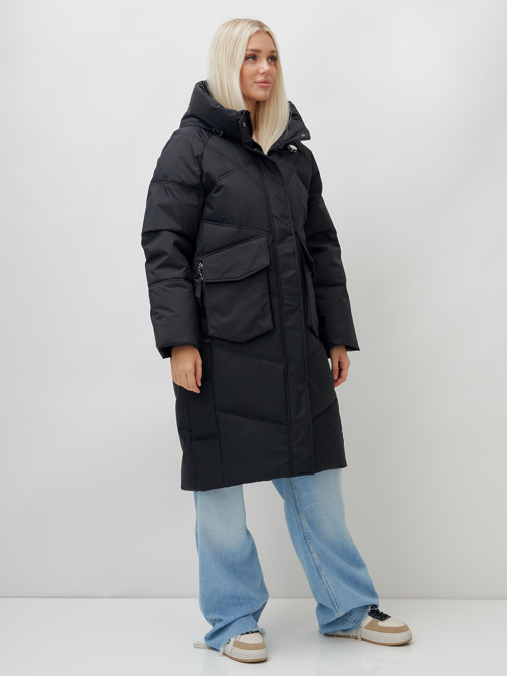Пальто летучая мышь женское с капюшоном зимнее черного цвета 9618Ch