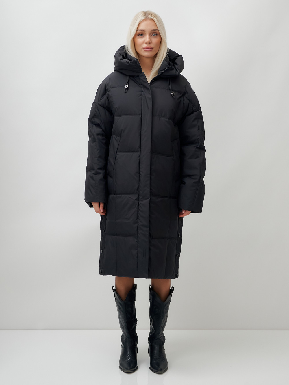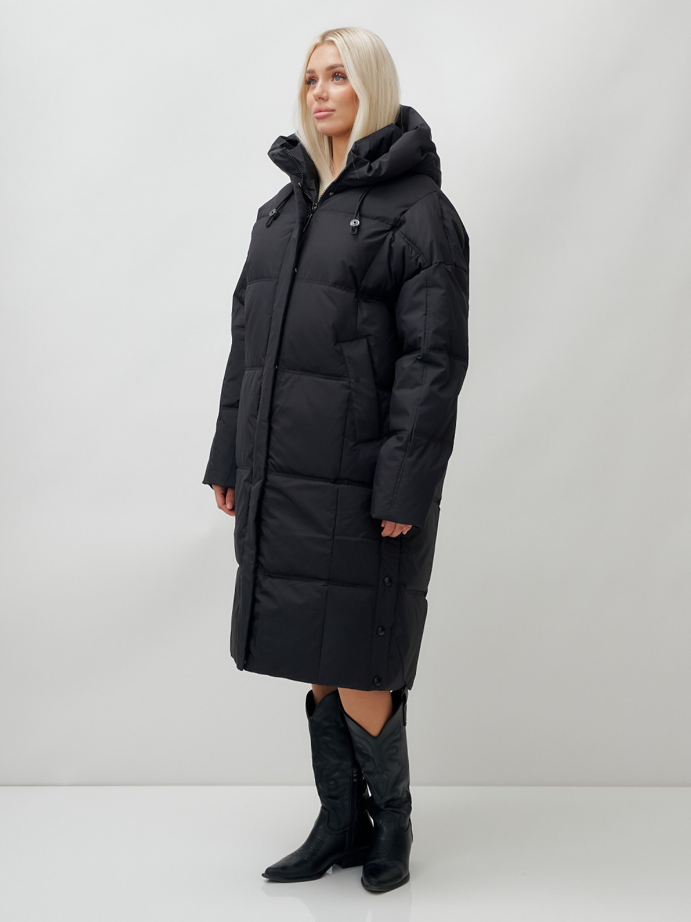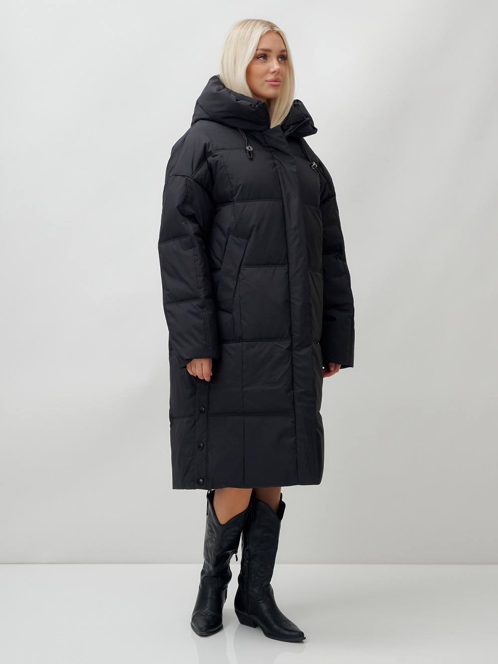 Пальто летучая мышь женское с капюшоном зимнее черного цвета 9619Ch