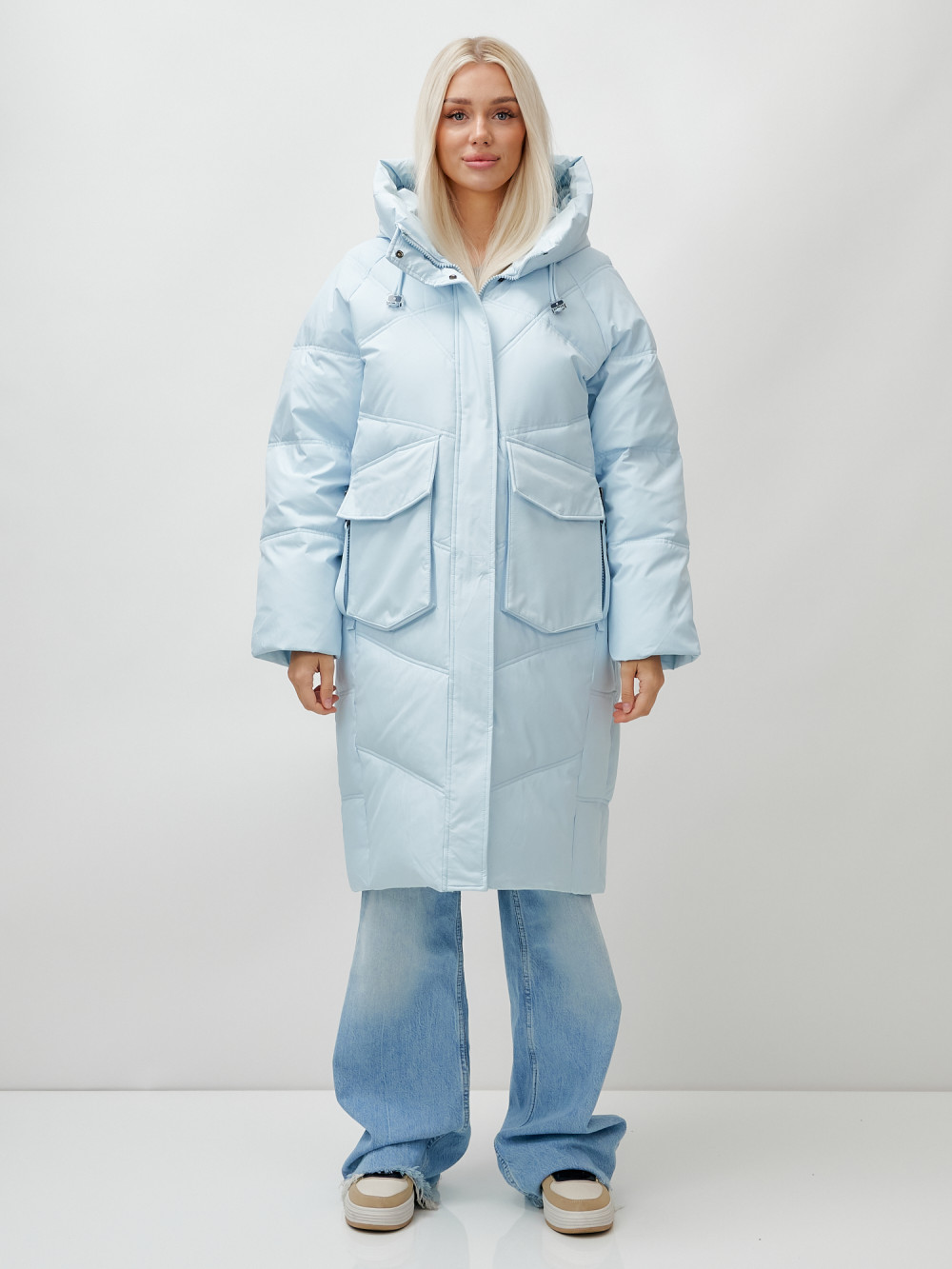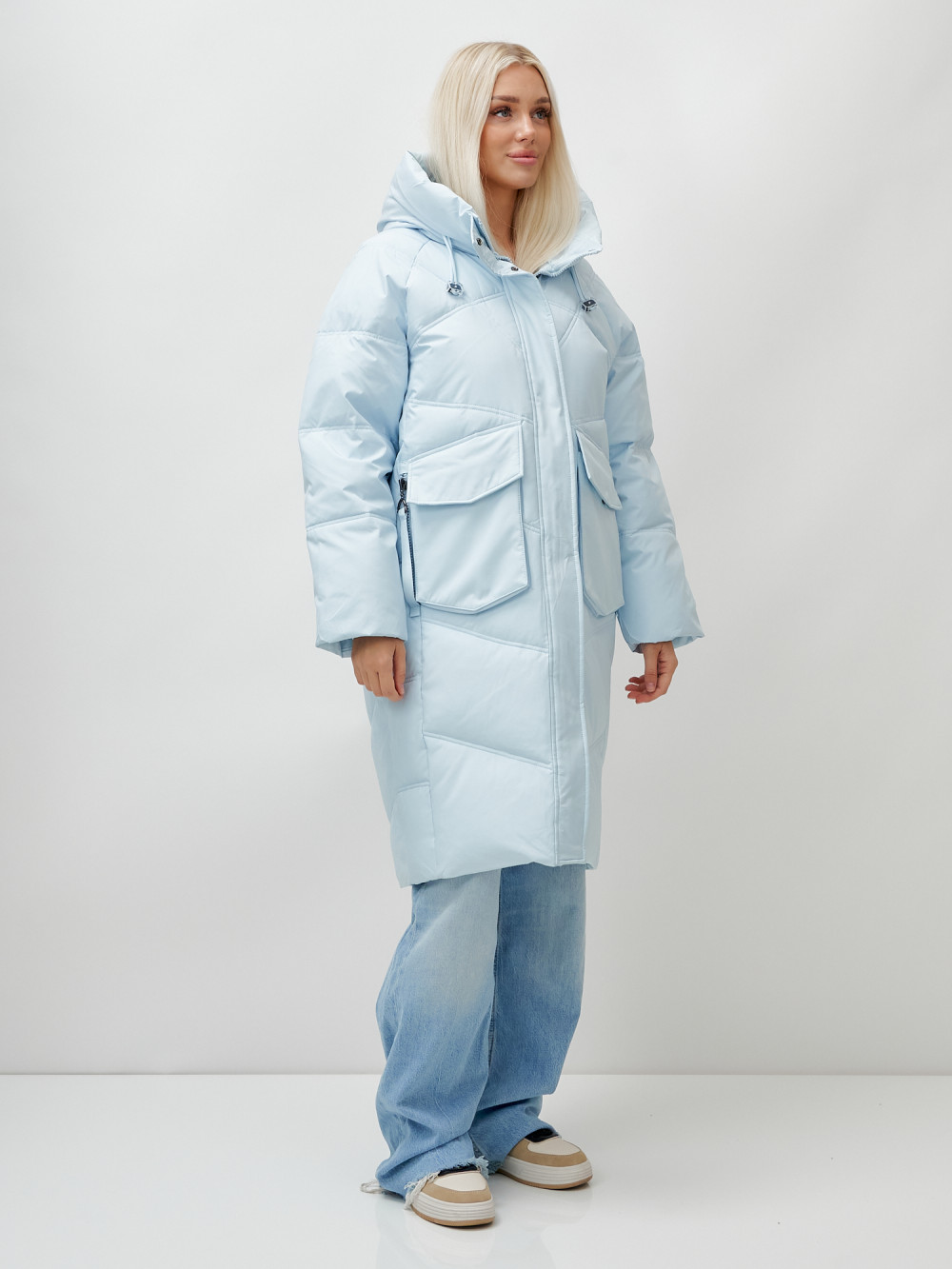 Пальто летучая мышь женское с капюшоном зимнее голубого цвета 9618Gl