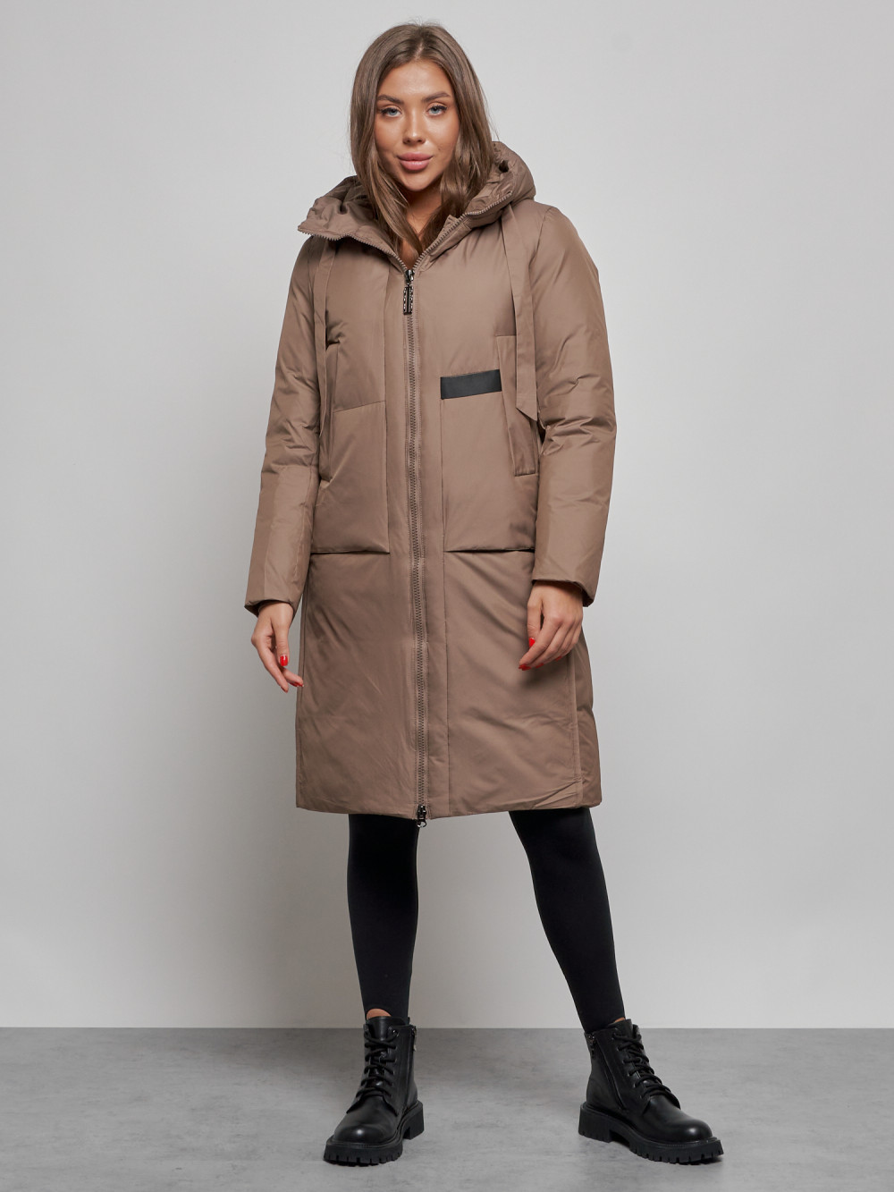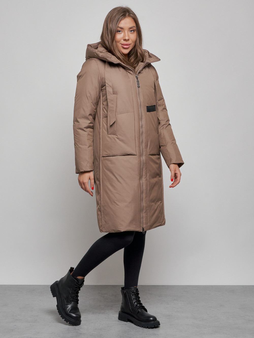 Пальто утепленное молодежное зимнее женское коричневого цвета 52359K