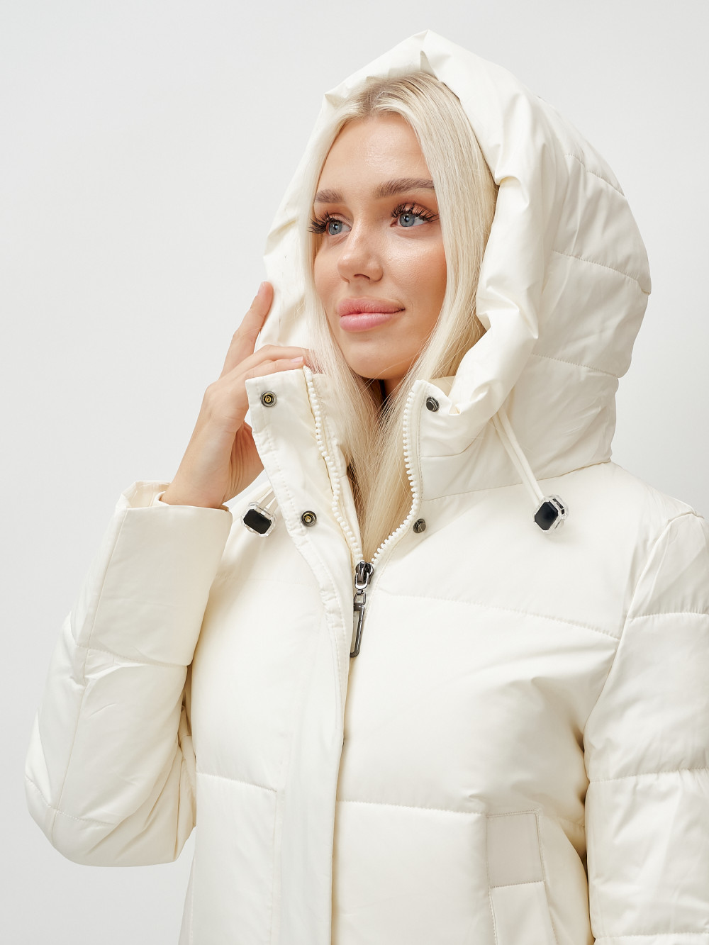 Пальто утепленное стеганное зимнее с капюшоном женское бежевого цвета 9608B