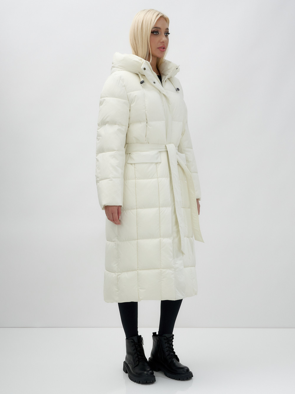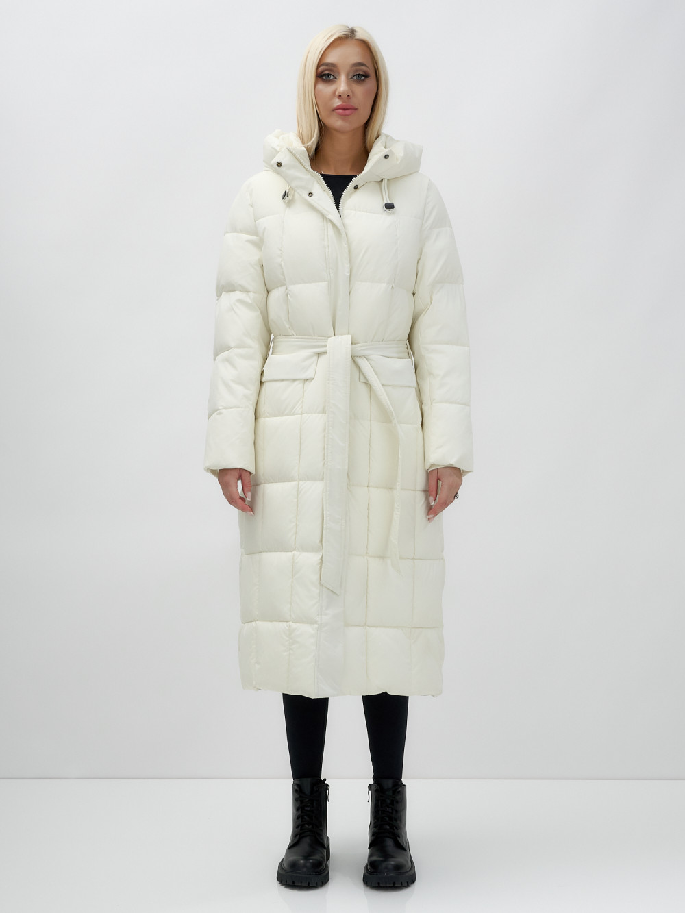 Пальто утепленное стеганное зимнее с капюшоном женское бежевого цвета 9609B