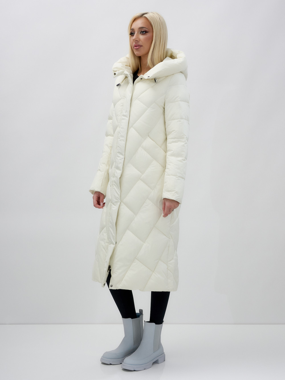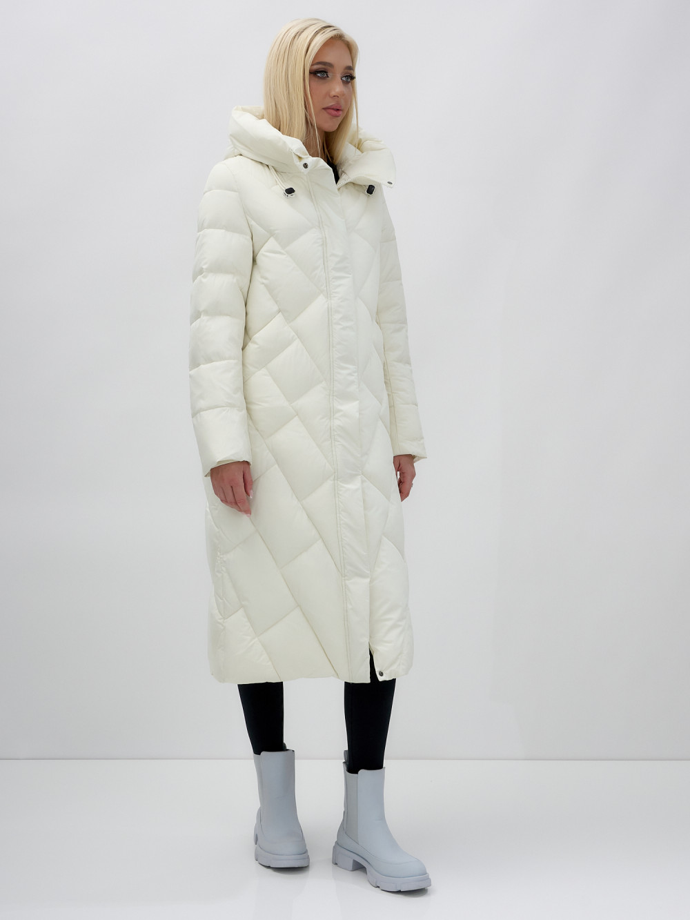 Пальто утепленное стеганное зимнее с капюшоном женское бежевого цвета 9612B