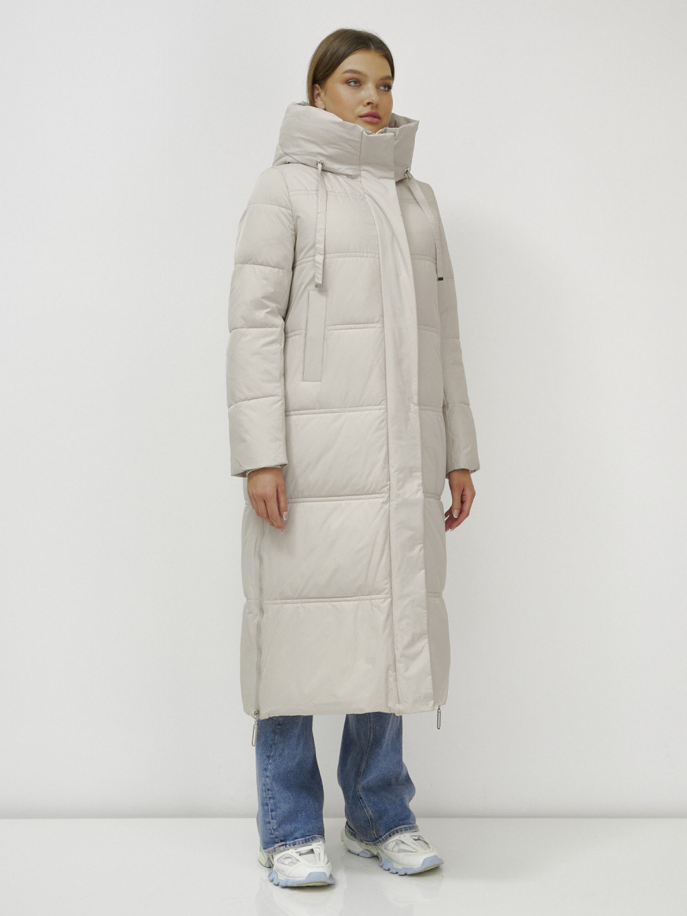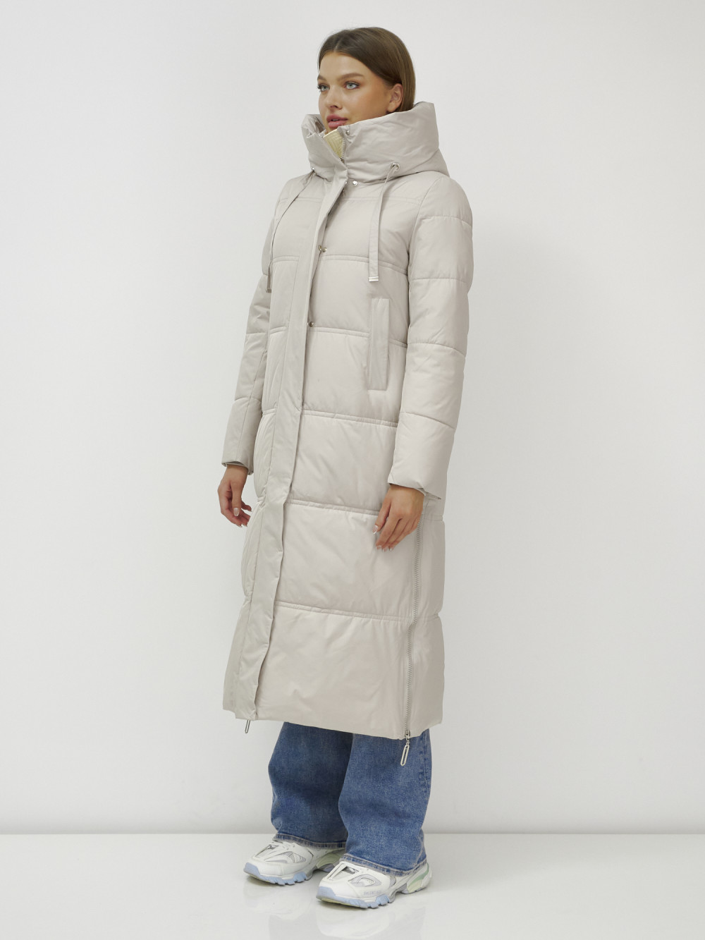 Пальто утепленное стеганное зимнее с капюшоном женское бежевого цвета 9625B
