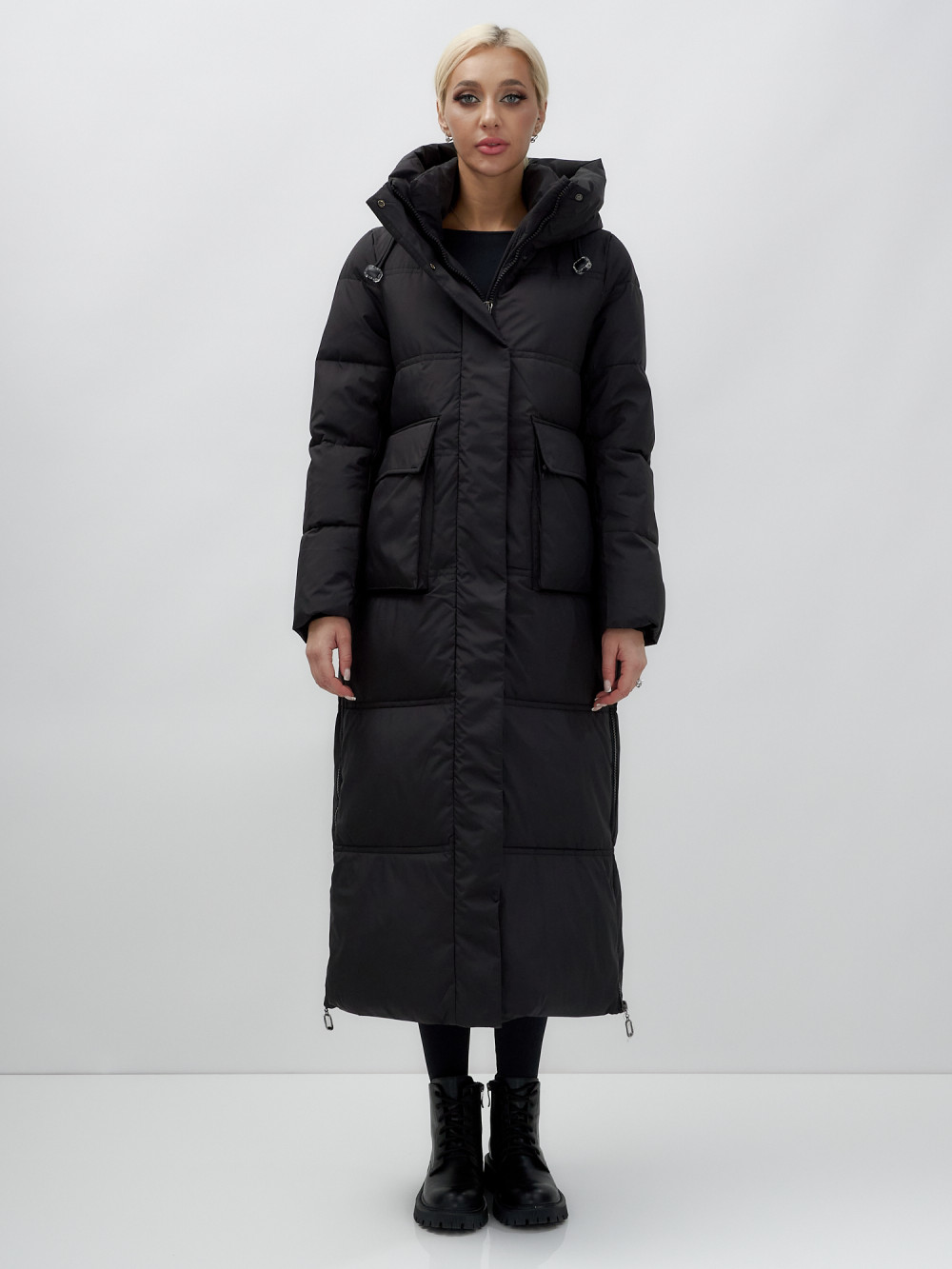 Пальто утепленное стеганное зимнее с капюшоном женское черного цвета 9602Ch
