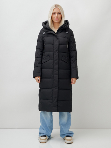Пальто утепленное стеганное зимнее с капюшоном женское черного цвета 9605Ch