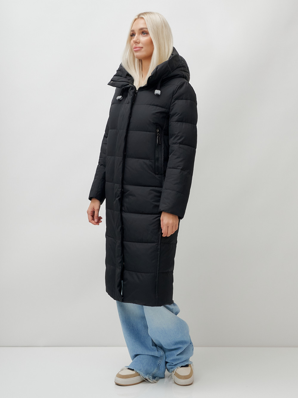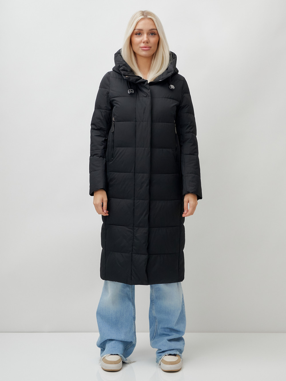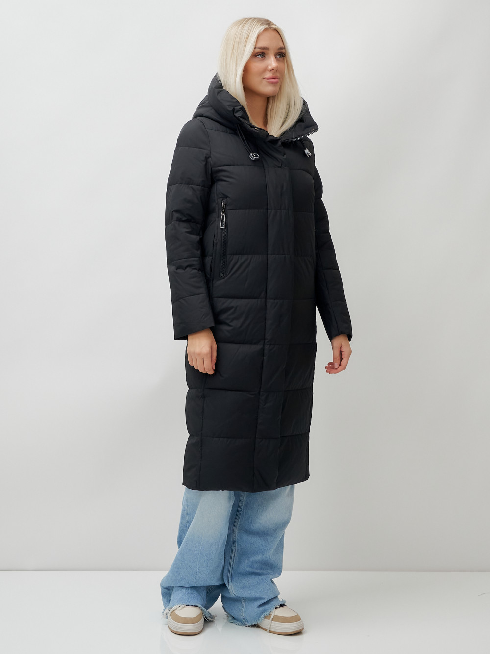 Пальто утепленное стеганное зимнее с капюшоном женское черного цвета 9606Ch