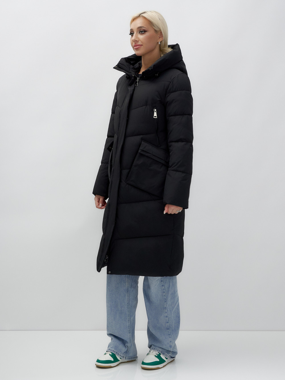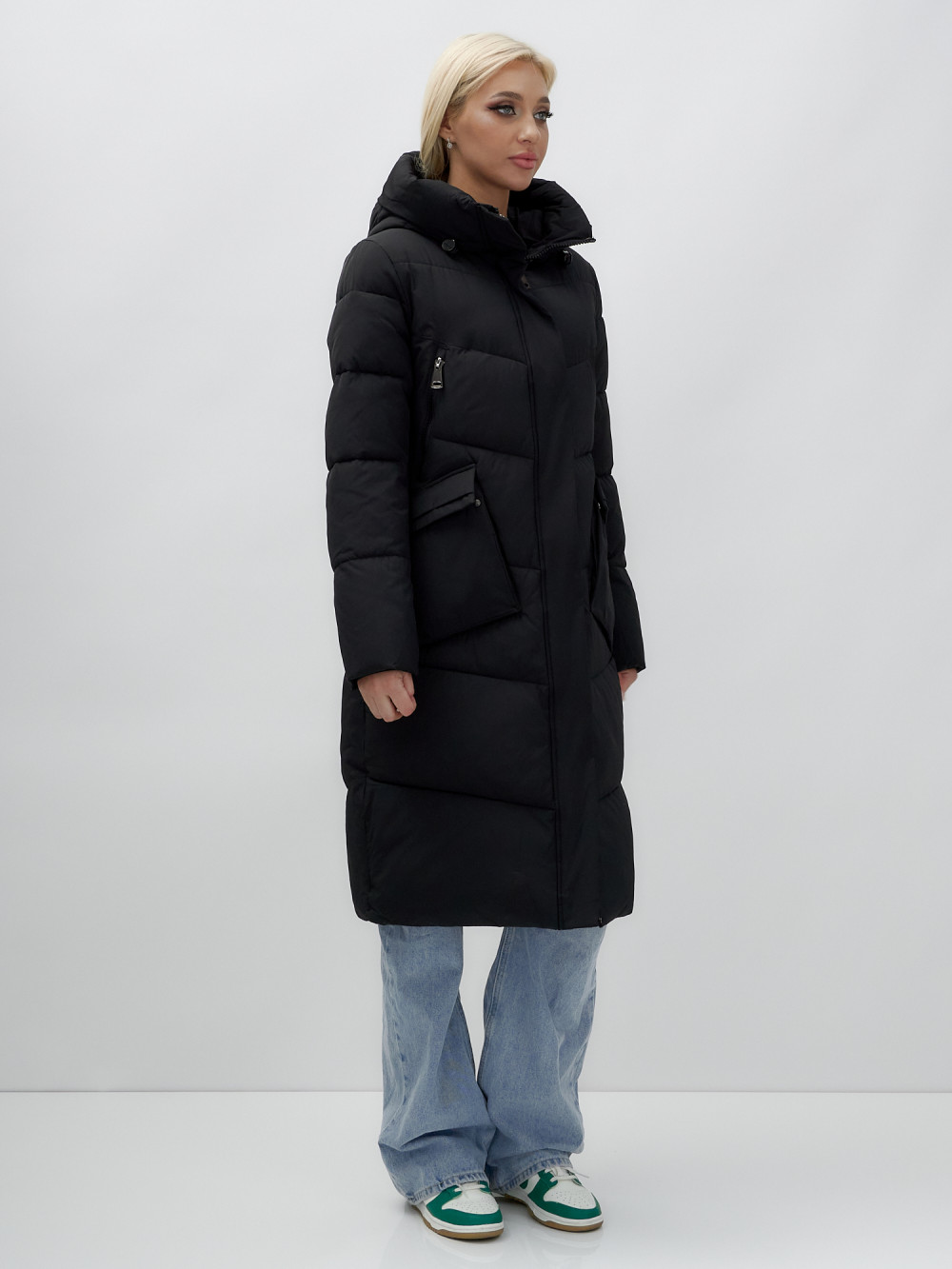 Пальто утепленное стеганное зимнее с капюшоном женское черного цвета 9639Ch