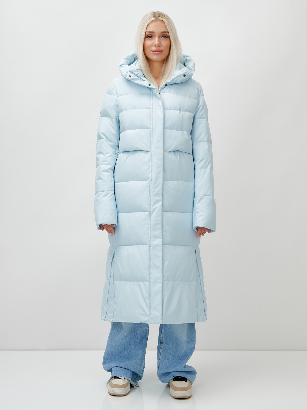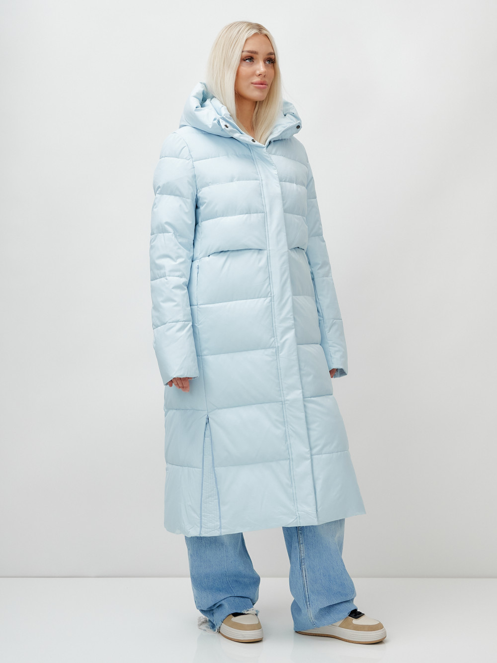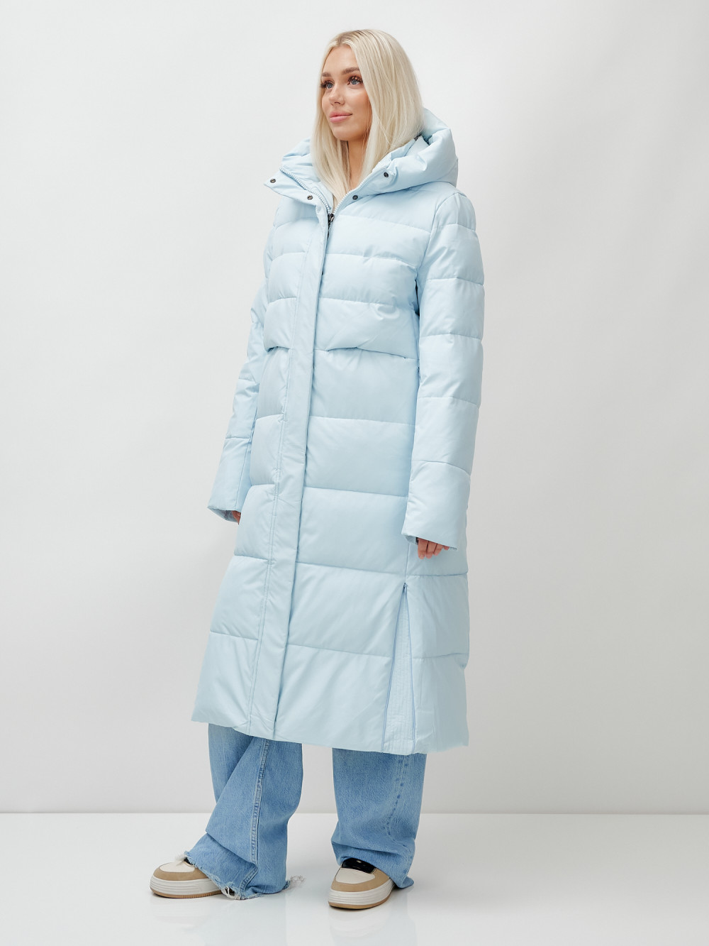 Пальто утепленное стеганное зимнее с капюшоном женское голубого цвета 9620Gl
