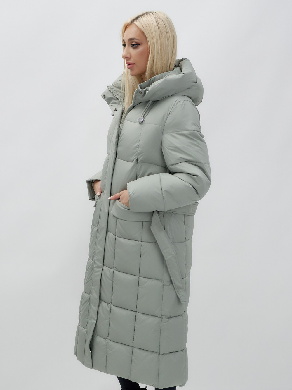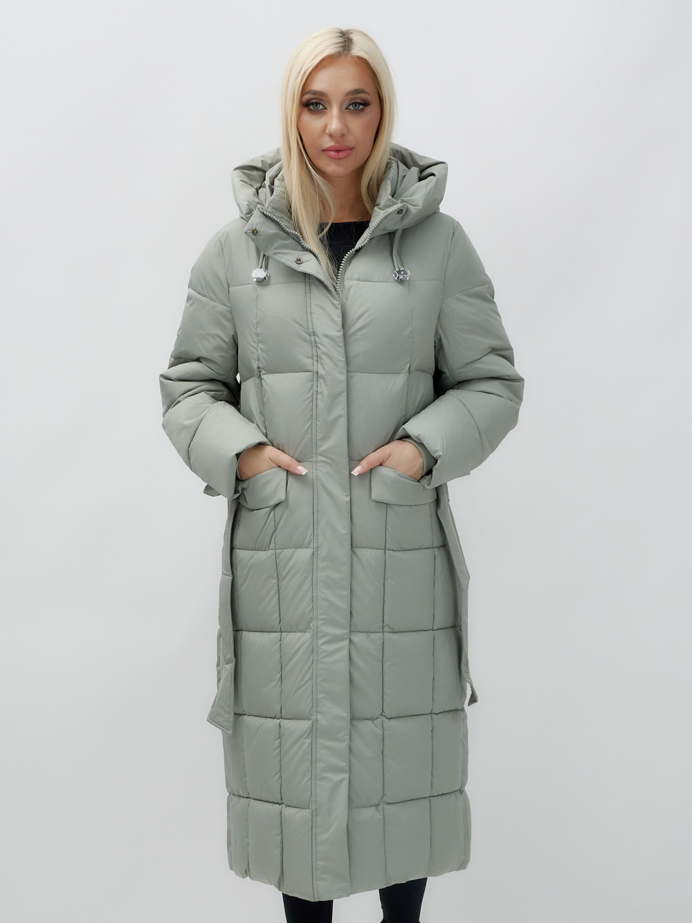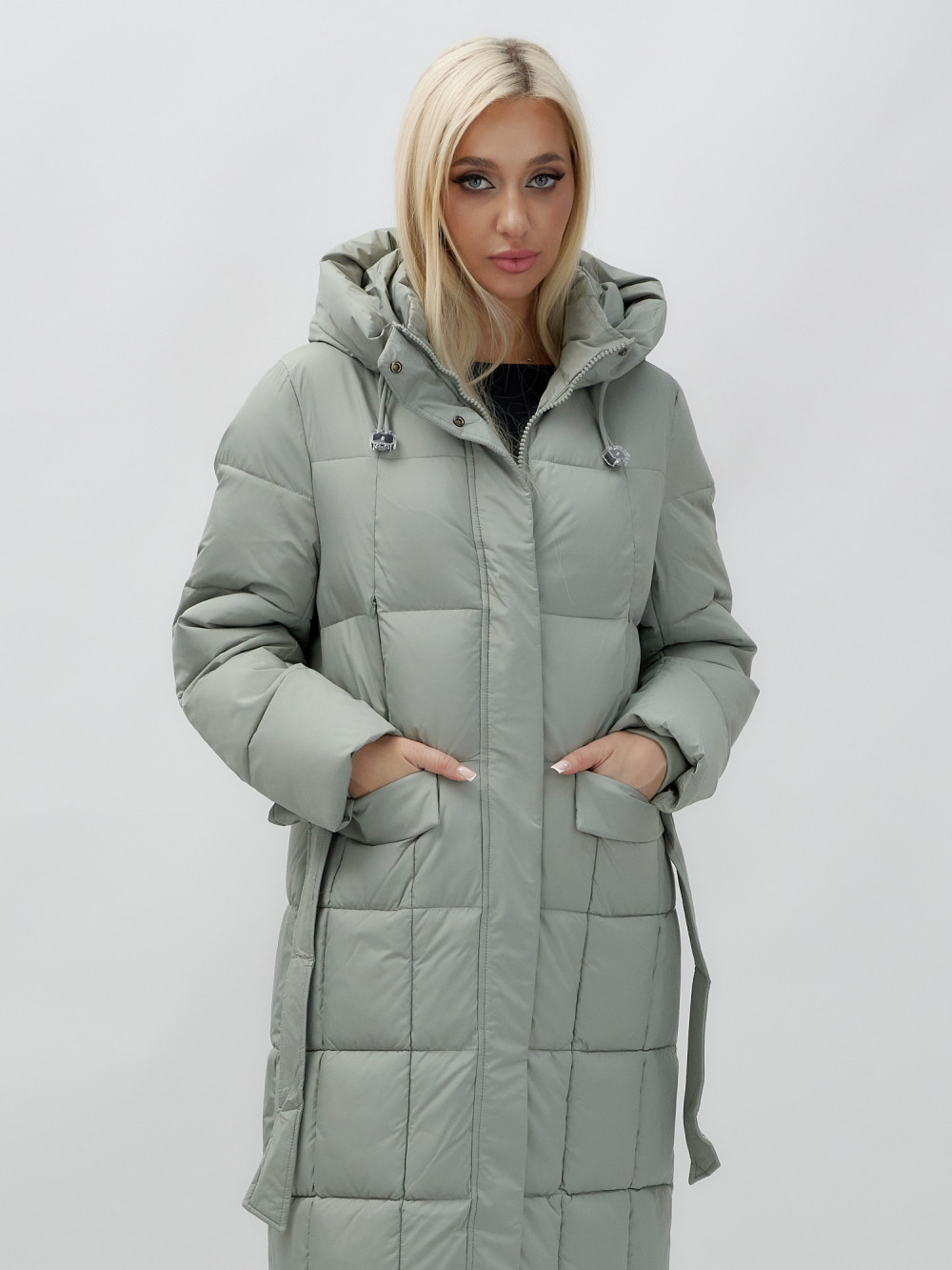 Пальто утепленное стеганное зимнее с капюшоном женское зеленого цвета 9609Z