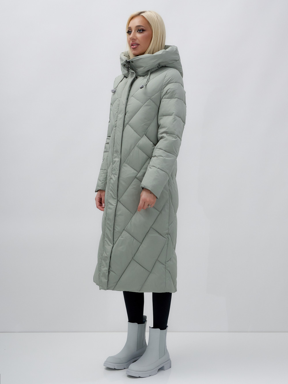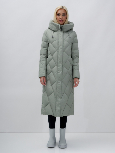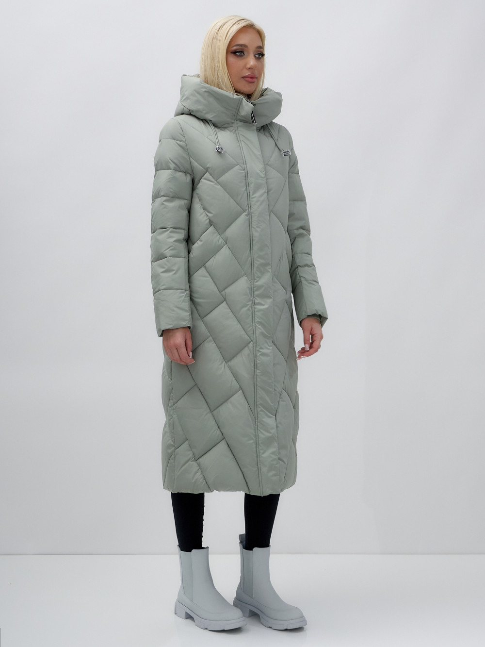 Пальто утепленное стеганное зимнее с капюшоном женское зеленого цвета 9612Z