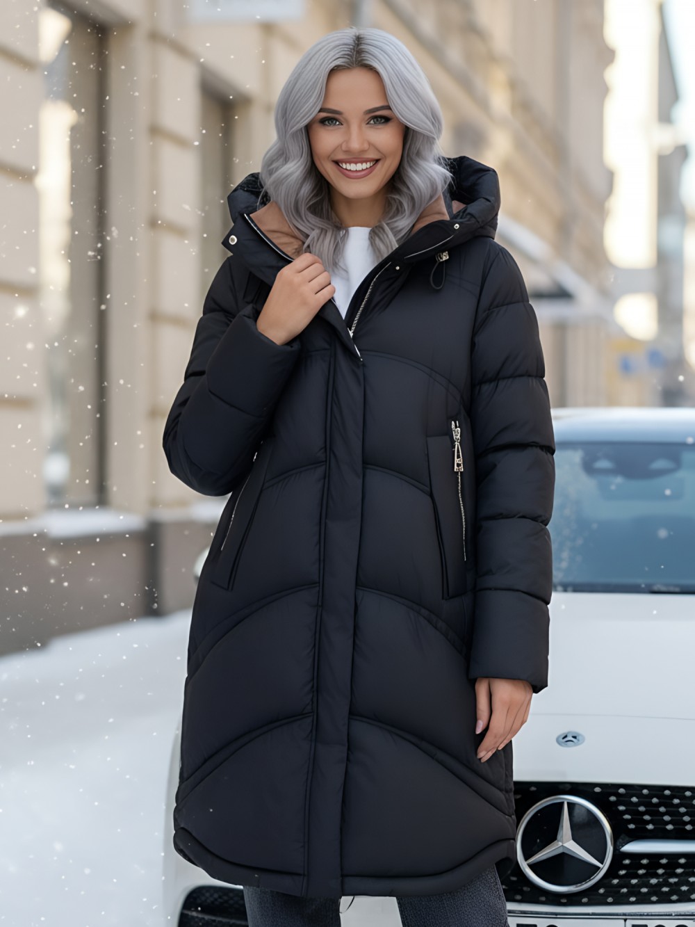 С стильным стоячим воротником и удлиненной длиной до колен, это пальто сочетает в себе элегантный и офисный стиль, а также подходит для повседневной носки. Не съемный капюшон и фиксирующие элементы по низу обеспечивают дополнительную защиту от непогоды.