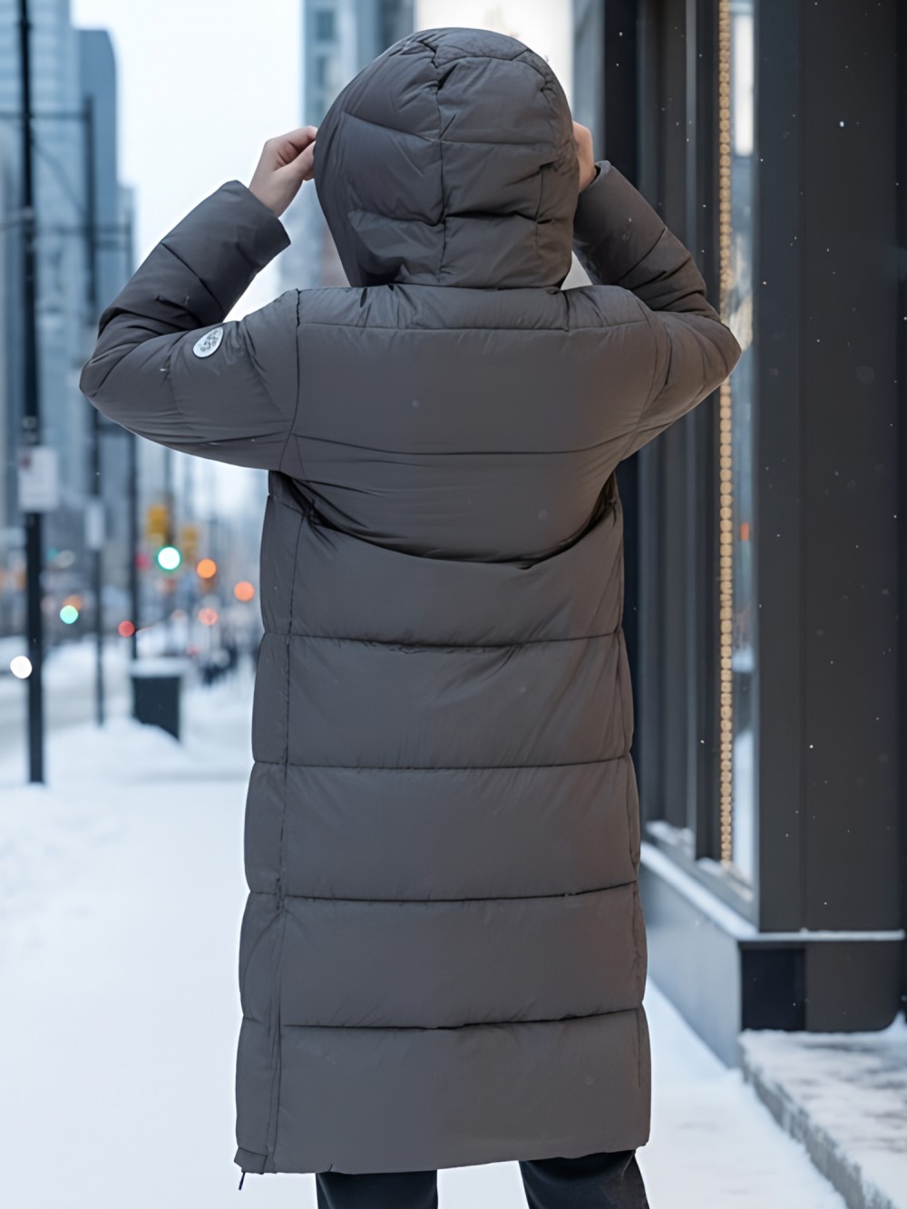 Капюшон не съемный и оснащен фиксатором, а внутренние карманы добавляют удобства. Двойная молния служит надежной застежкой, а проклеенные и прошитые внутренние швы усиливают защиту от ветра. Модель отличается элегантным офисным и повседневным стилем, а гладкая стеганая фактура материала придает ей современный вид.