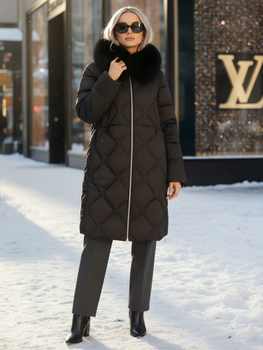 Пять благородных оттенков коллекции осень-зима 2025 – глубокий черный, роскошный коричневый, изысканный светло-коричневый, элегантный темно-коричневый и благородный темно-зеленый – великолепно сочетаются с натуральным мехом песца. Удлиненный силуэт до колена и свободный крой идеальны для размеров 48-56.