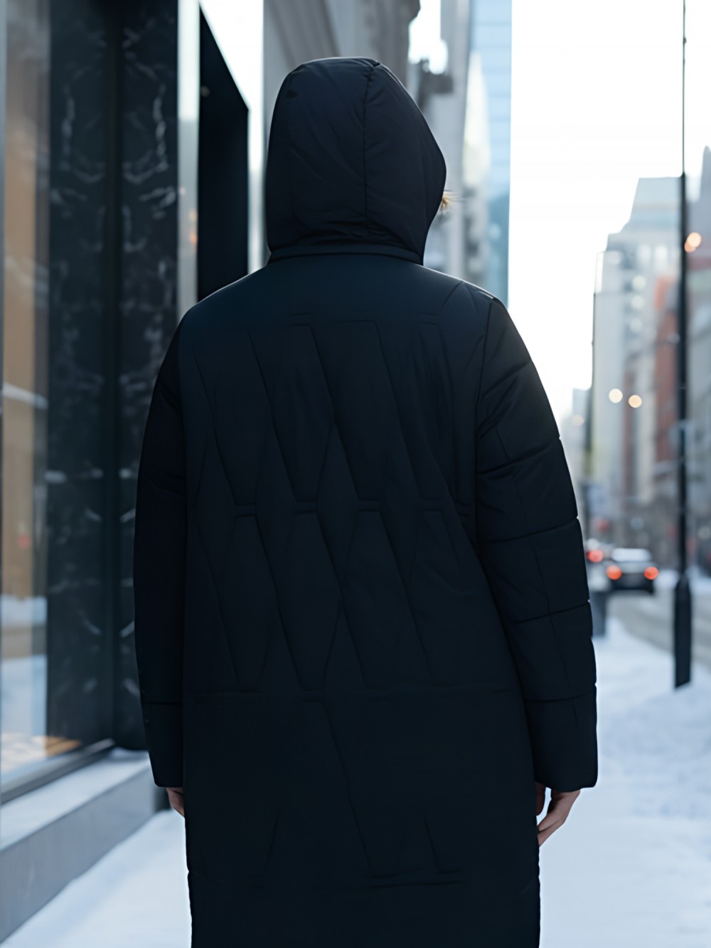 Удлиненная длина до колена и прямой, свободный покрой создают стильный силуэт, а капюшон с фиксатором добавляет практичности и защиты от холодного ветра. Внутренние карманы с кнопочной застежкой обеспечивают удобство, а особая потайная застежка внутри подкладки открывает доступ к наполнителю, визуально демонстрируя высокое качество верблюжьей шерсти, что гарантирует вам тепло и уют.