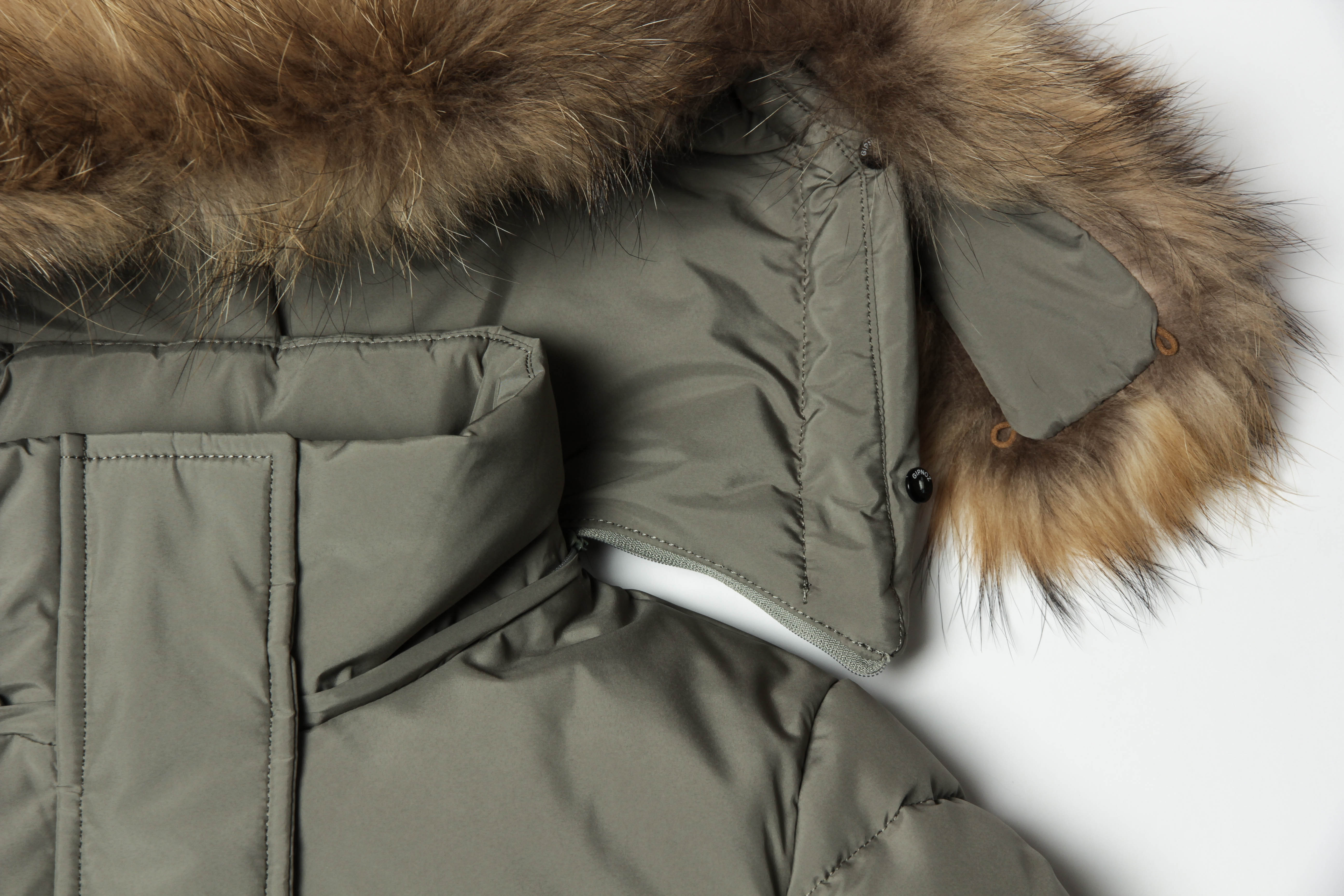 карман на подкладке изделия. Капюшон и мех отстегиваются. Мех – натуральный енот,